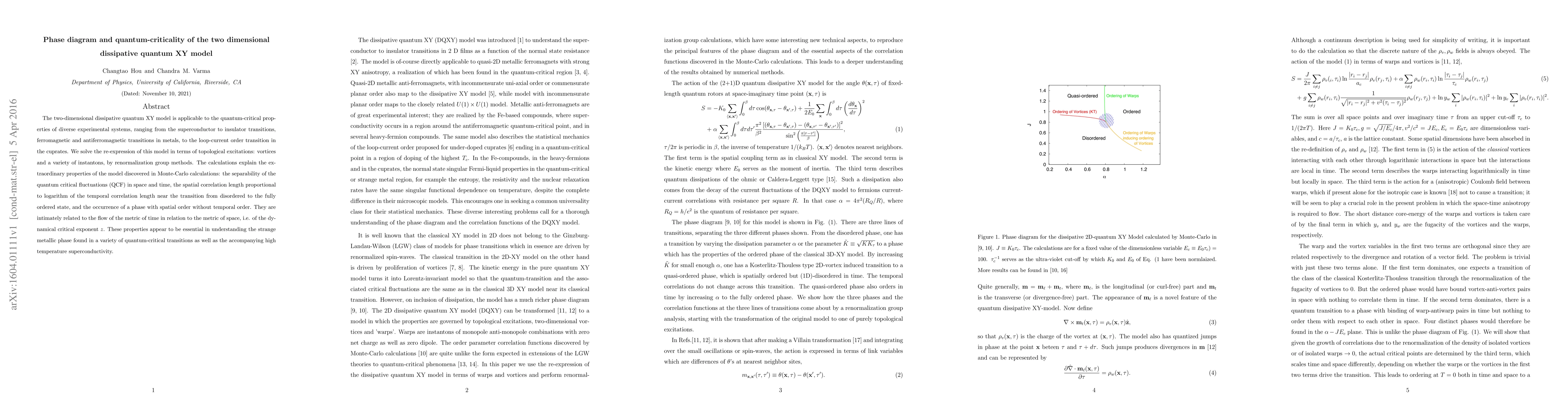 The two-dimensional dissipative quantum XY model is applicable to the quantum-critical properties of diverse experimental systems, ranging from the superconductor to insulator transitions, ferromagnetic and antiferromagnetic transitions in metals, to the loop-current order transition in the cuprates. We solve the re-expression of this model in terms of topological excitations: vortices and a variety of instantons, by renormalization group methods. The calculations explain the extraordinary properties of the model discovered in Monte-Carlo calculations: the separability of the quantum critical fluctuations (QCF) in space and time, the spatial correlation length proportional to logarithm of the temporal correlation length near the transition from disordered to the fully ordered state, and the occurrence of a phase with spatial order without temporal order. They are intimately related to the flow of the metric of time in relation to the metric of space, i.e. of the dynamical critical exponent $z$. These properties appear to be essential in understanding the strange metallic phase found in a variety of quantum-critical transitions as well as the accompanying high temperature superconductivity.