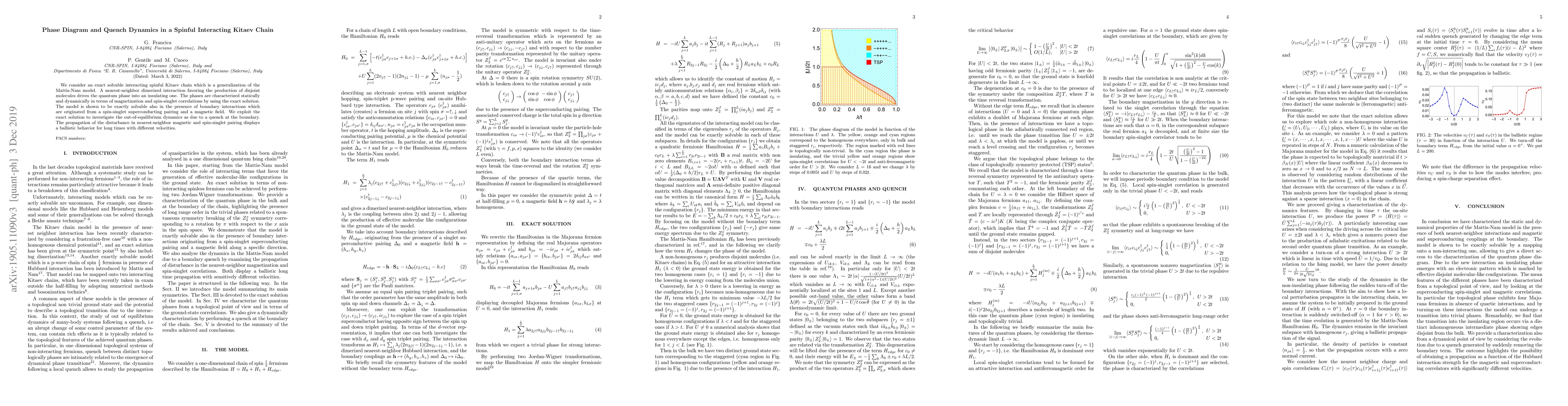 We consider an exact solvable interacting spinful Kitaev chain which is a generalization of the Mattis-Nam model. A nearest-neighbor dimerized interaction favoring the production of disjoint molecules drives the quantum phase into an insulating one. The phases are characterized statically and dynamically in terms of magnetization and spin-singlet correlations by using the exact solution. The model is shown to be exactly solvable also in the presence of boundary interactions which are originated from a spin-singlet superconducting pairing and a magnetic field. We exploit the exact solution to investigate the out-of-equilibrium dynamics as due to a quench at the boundary. The propagation of the disturbance in nearest-neighbor magnetic and spin-singlet pairing displays a ballistic behavior for long times with different velocities.