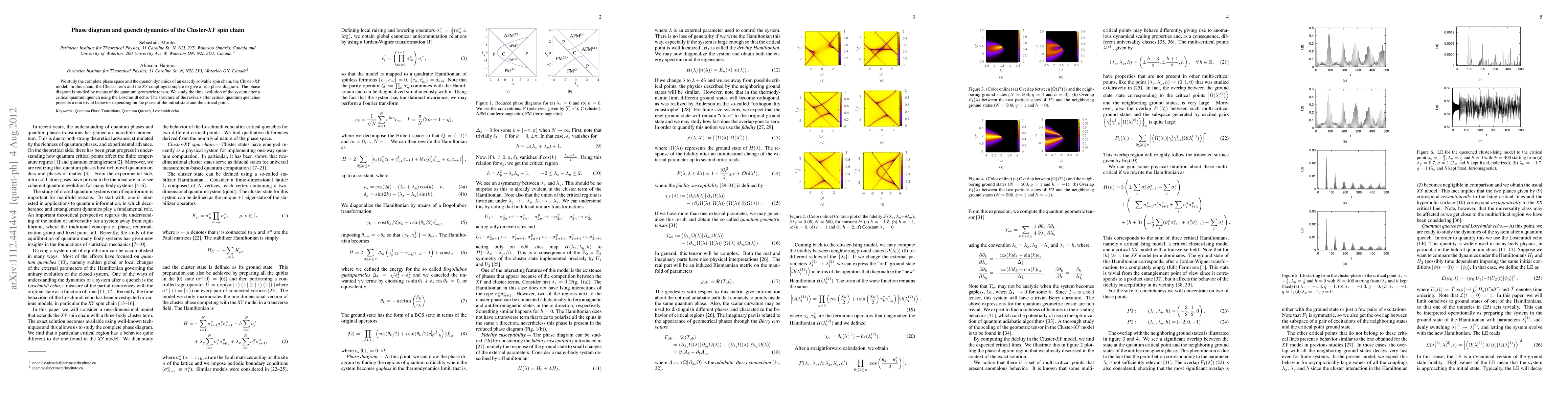 We study the complete phase space and the quench dynamics of an exactly solvable spin chain, the cluster-XY model. In this chain, the cluster term and the XY couplings compete to give a rich phase diagram. The phase diagram is studied by means of the quantum geometric tensor. We study the time evolution of the system after a critical quantum quench using the Loschmidt echo. The structure of the revivals after critical quantum quenches presents a non trivial behavior depending on the phase of the initial state and the critical point.