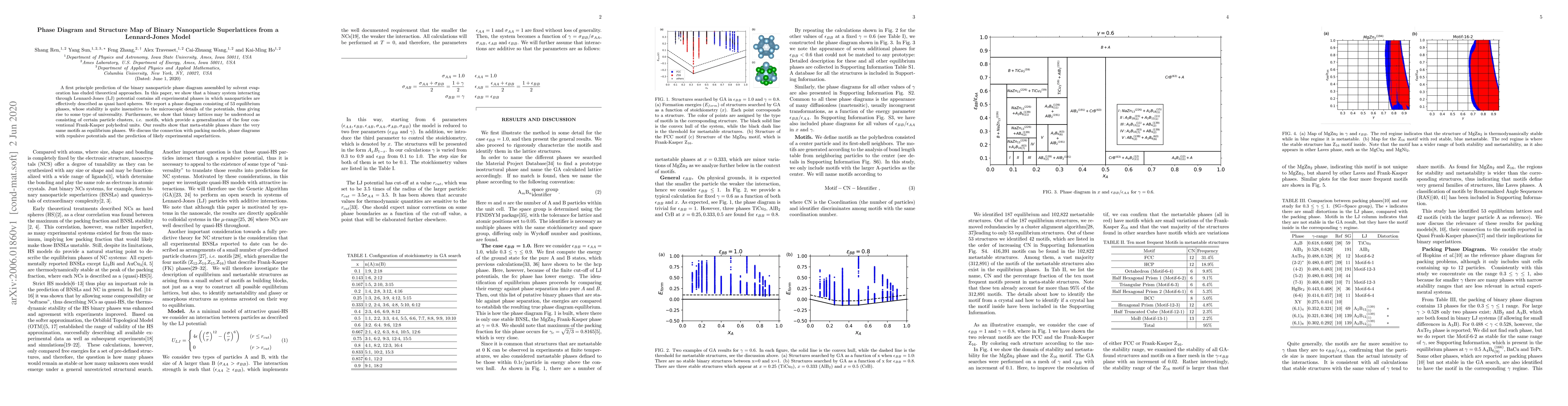 A first principle prediction of the binary nanoparticle phase diagram assembled by solvent evaporation has eluded theoretical approaches. In this paper, we show that a binary system interacting through Lennard-Jones (LJ) potential contains all experimental phases in which nanoparticles are effectively described as quasi hard spheres. We report a phase diagram consisting of 53 equilibrium phases, whose stability is quite insensitive to the microscopic details of the potentials, thus giving rise to some type of universality. Furthermore, we show that binary lattices may be understood as consisting of certain particle clusters, i.e. motifs, which provide a generalization of the four conventional Frank-Kasper polyhedral units. Our results show that meta-stable phases share the very same motifs as equilibrium phases. We discuss the connection with packing models, phase diagrams with repulsive potentials and the prediction of likely experimental superlattices.