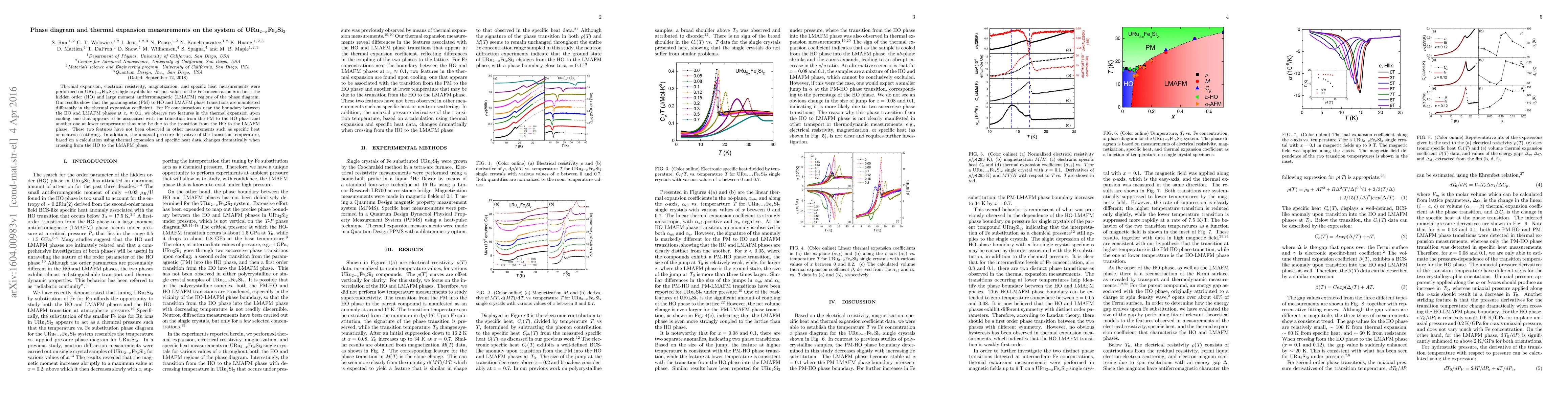 Thermal expansion, electrical resistivity, magnetization, and specific heat measurements were performed on URu$_{2-x}$Fe$_{x}$Si$_{2}$ single crystals for various values of the Fe concentration $x$ in both the hidden order (HO) and large moment antiferromagnetic (LMAFM) regions of the phase diagram. Our results show that the paramagnetic (PM) to HO and LMAFM phase transitions are manifested differently in the thermal expansion coefficient. For Fe concentrations near the boundary between the HO and LMAFM phases at $x_c$ ~ 0.1, we observe two features in the thermal expansion upon cooling, one that appears to be associated with the transition from the PM to the HO phase and another one at lower temperature that may be due to the transition from the HO to the LMAFM phase. These two features have not been observed in other measurements such as specific heat or neutron scattering. In addition, the uniaxial pressure derivative of the transition temperature, based on a calculation using thermal expansion and specific heat data, changes dramatically when crossing from the HO to the LMAFM phase.