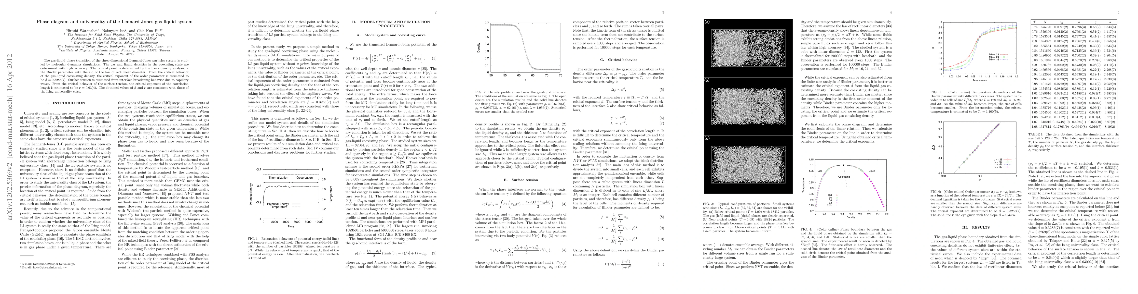 The gas-liquid phase transition of the three-dimensional Lennard-Jones particles system is studied by molecular dynamics simulations. The gas and liquid densities in the coexisting state are determined with high accuracy. The critical point is determined by the block density analysis of the Binder parameter with the aid of the law of rectilinear diameter. From the critical behavior of the gas-liquid coexsisting density, the critical exponent of the order parameter is estimated to be $\beta = 0.3285(7)$. Surface tension is estimated from interface broadening behavior due to capillary waves. From the critical behavior of the surface tension, the critical exponent of the correlation length is estimated to be $\nu = 0.63 (4)$. The obtained values of $\beta$ and $\nu$ are consistent with those of the Ising universality class.