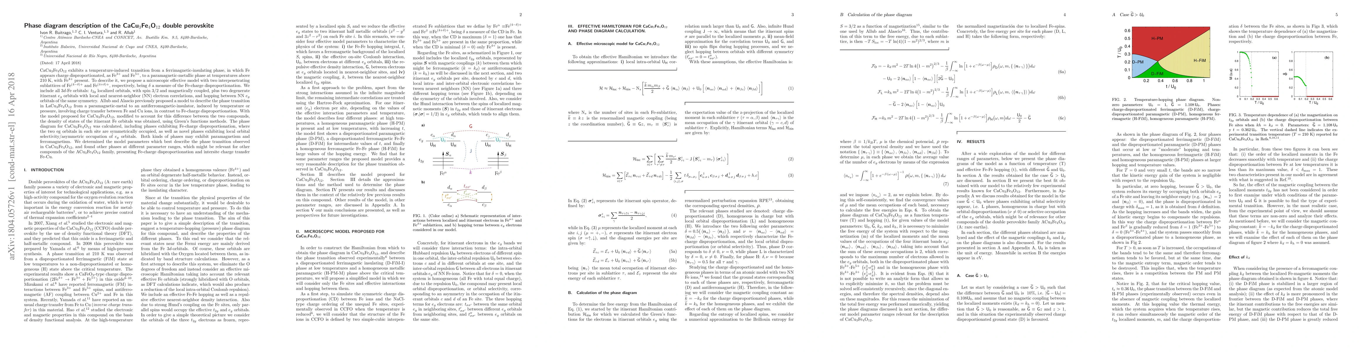CaCu$_3$Fe$_4$O$_{12}$ exhibits a temperature-induced transition from a ferrimagnetic-insulating phase, in which Fe appears charge disproportionated, as Fe$^{3+}$ and Fe$^{5+}$, to a paramagnetic-metallic phase at temperatures above 210 K, with Fe$^{4+}$ present. To describe it, we propose a microscopic effective model with two interpenetrating sublattices of Fe$^{(4-\delta)+}$ and Fe$^{(4+\delta)+}$, respectively, being $\delta$ the Fe-charge disproportionation. We include all $3d$-Fe orbitals: $t_{2g}$ localized orbitals, with spin 3/2 and magnetically coupled, plus two degenerate itinerant $e_g$ orbitals with local and nearest-neighbor (NN) electron correlations, and hopping between NN $e_g$ orbitals of the same symmetry. Allub and Alascio previously proposed a model to describe the phase transition in LaCu$_3$Fe$_4$O$_{12}$ from a paramagnetic-metal to an antiferromagnetic-insulator, induced by temperature or pressure, involving charge transfer between Fe and Cu ions, in contrast to Fe-charge disproportionation. With the model proposed for CaCu$_3$Fe$_4$O$_{12}$, modified to account for this difference between the two compounds, the density of states of the itinerant Fe orbitals was obtained, using Green's functions methods. The phase diagram for CaCu$_3$Fe$_4$O$_{12}$ was calculated, including phases exhibiting Fe-charge disproportionation, where the two eg orbitals in each site are symmetrically occupied, as well as novel phases exhibiting local orbital selectivity/asymmetric occupation of $e_g$ orbitals. Both kinds of phases may exhibit paramagnetism and ferromagnetism. We determined the model parameters which best describe the phase transition observed in CaCu$_3$Fe$_4$O$_{12}$, and found other phases at different parameter ranges, which might be relevant for other compounds of the ACu$_3$Fe$_4$O$_{12}$ family, which present both types of transitions.