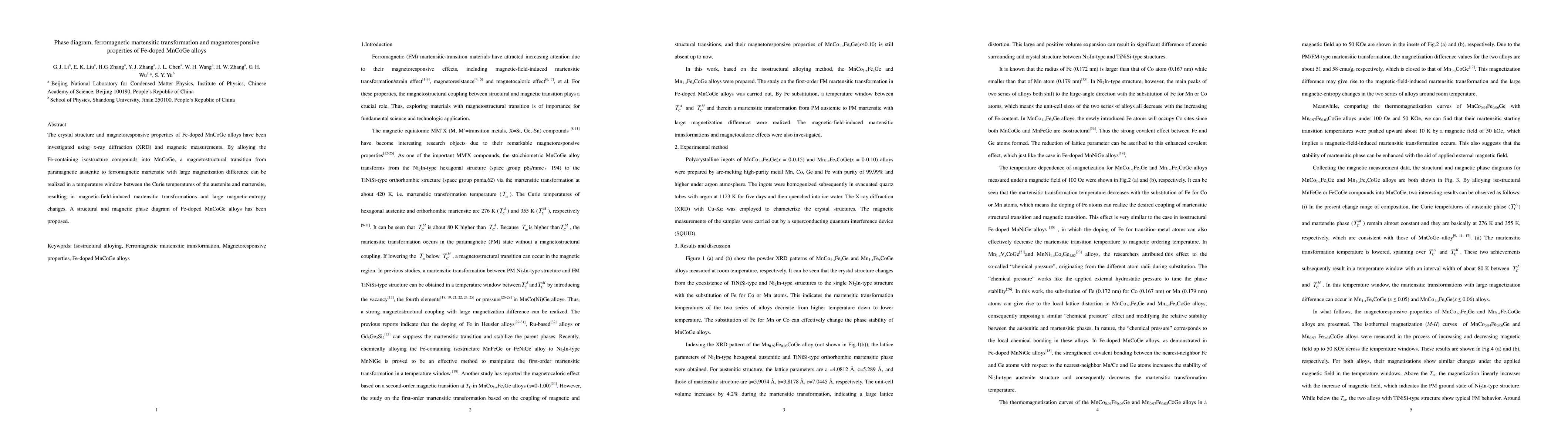 This paper investigates Fe-doped MnCoGe alloys, revealing a magnetostructural transition from paramagnetic austenite to ferromagnetic martensite with significant magnetic-entropy changes, leading to magnetic-field-induced martensitic transformations and a proposed structural and magnetic phase diagram.