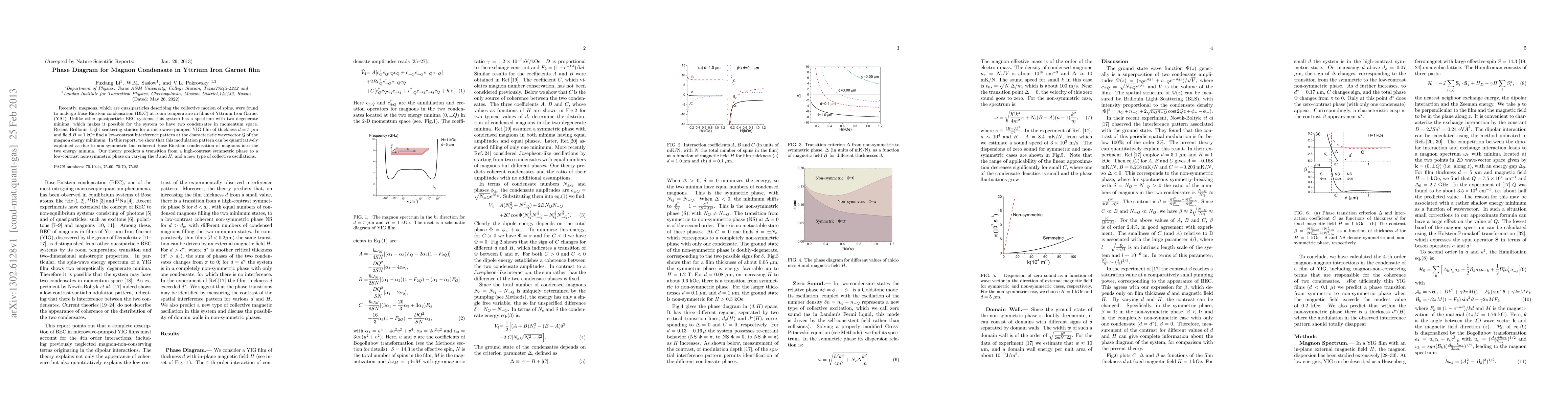 Recently, magnons, which are quasiparticles describing the collective motion of spins, were found to undergo Bose-Einstein condensation (BEC) at room temperature in films of Yttrium Iron Garnet (YIG). Unlike other quasiparticle BEC systems, this system has a spectrum with two degenerate minima, which makes it possible for the system to have two condensates in momentum space. Recent Brillouin Light scattering studies for a microwave-pumped YIG film of thickness d=5 $\mu$m and field H=1 kOe find a low-contrast interference pattern at the characteristic wavevector $Q$ of the magnon energy minimum. In this report, we show that this modulation pattern can be quantitatively explained as due to non-symmetric but coherent Bose-Einstein condensation of magnons into the two energy minima. Our theory predicts a transition from a high-contrast symmetric phase to a low-contrast non-symmetric phase on varying the $d$ and $H$, and a new type of collective oscillations.