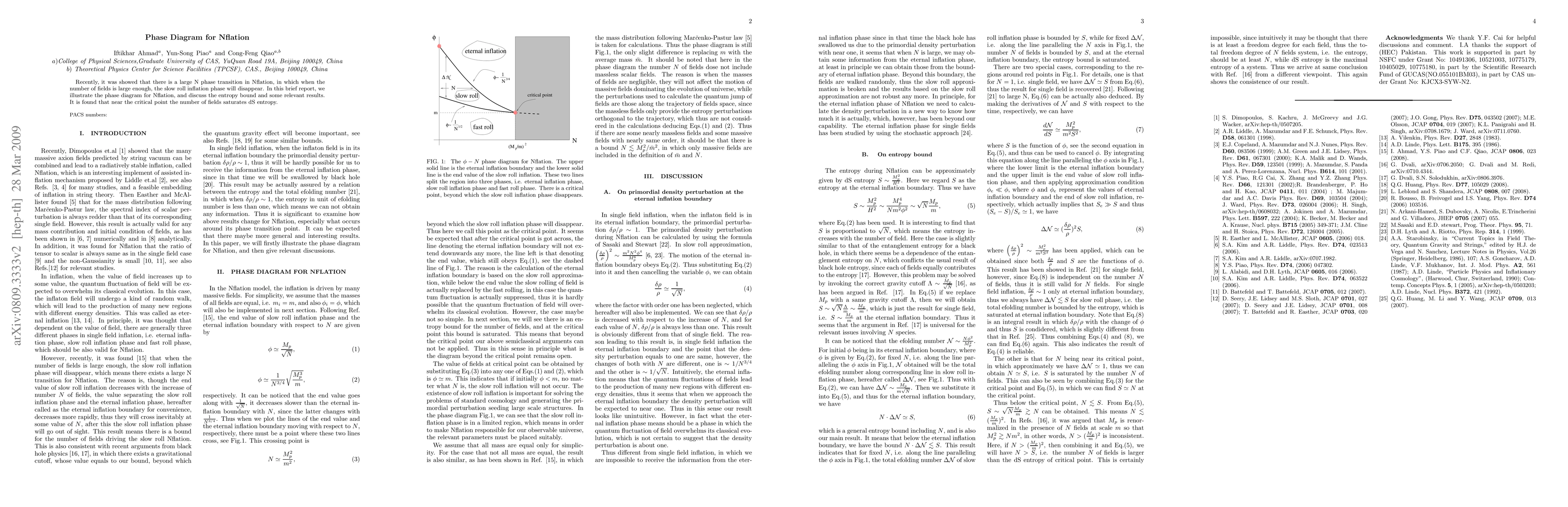 Recently, it was showed that there is a large N phase transition in Nflation, in which when the number of fields is large enough, the slow roll inflation phase will disappear. In this brief report, we illustrate the phase diagram for Nflation, and discuss the entropy bound and some relevant results. It is found that near the critical point the number of fields saturates dS entropy.