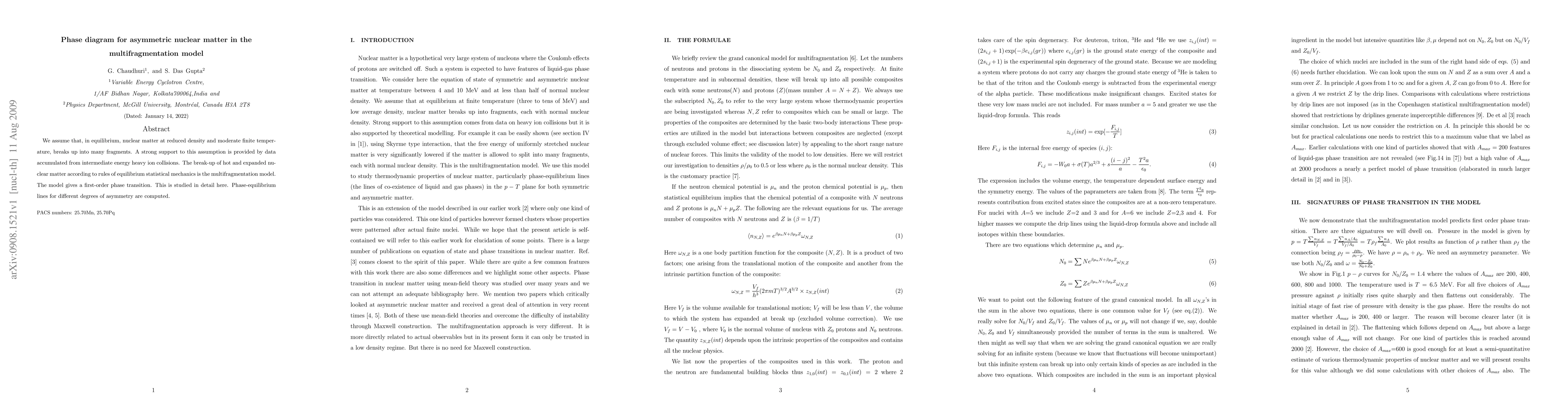 We assume that, in equilibrium, nuclear matter at reduced density and moderate finite temperature, breaks up into many fragments. A strong support to this assumption is provided by date accumulated from intermediate energy heavy ion collisions. The break-up of hot and expanded nuclear matter according to rules of equilibrium statistical mechanics is the multifragmentation model. The model gives a first order phase transition. This is studied in detail here. Phase-equilibrium lines for different degrees of asymmetry are computed.