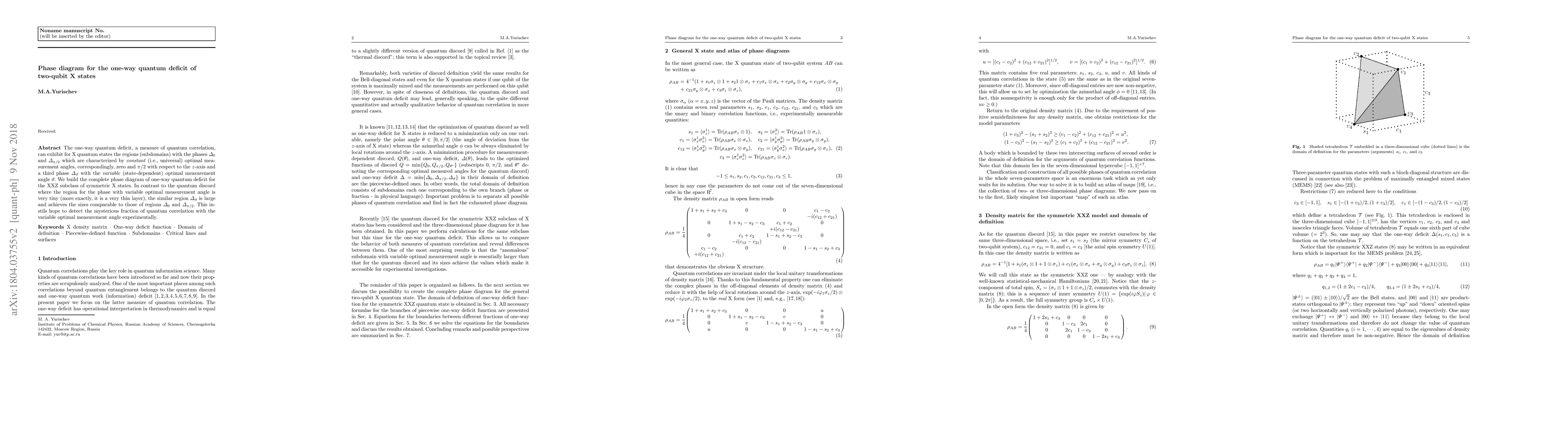 This paper constructs a phase diagram for the one-way quantum deficit in two-qubit X states, identifying three distinct phases with constant or variable optimal measurement angles. Unlike quantum discord, the phase with variable angles is notably large, suggesting potential for experimental detection of this quantum correlation fraction.