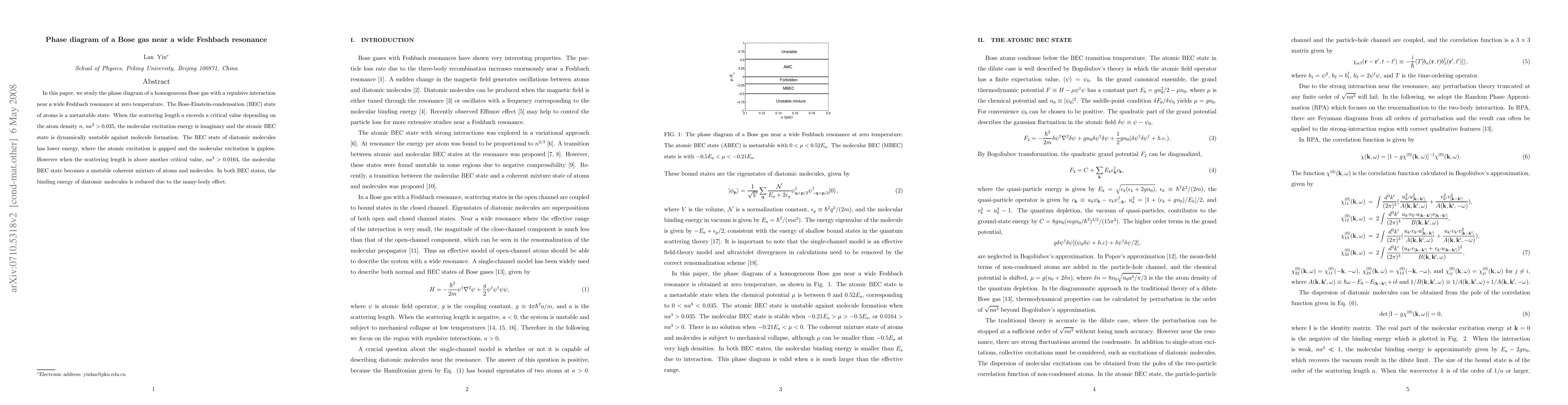 In this paper, we study the phase diagram of a homogeneous Bose gas with a repulsive interaction near a wide Feshbach resonance at zero temperature. The Bose-Einstein-condensation (BEC) state of atoms is a metastable state. When the scattering length $a$ exceeds a critical value depending on the atom density $n$, $na^3>0.035$, the molecular excitation energy is imaginary and the atomic BEC state is dynamically unstable against molecule formation. The BEC state of diatomic molecules has lower energy, where the atomic excitation is gapped and the molecular excitation is gapless. However when the scattering length is above another critical value, $na^3>0.0164$, the molecular BEC state becomes a unstable coherent mixture of atoms and molecules. In both BEC states, the binding energy of diatomic molecules is reduced due to the many-body effect.