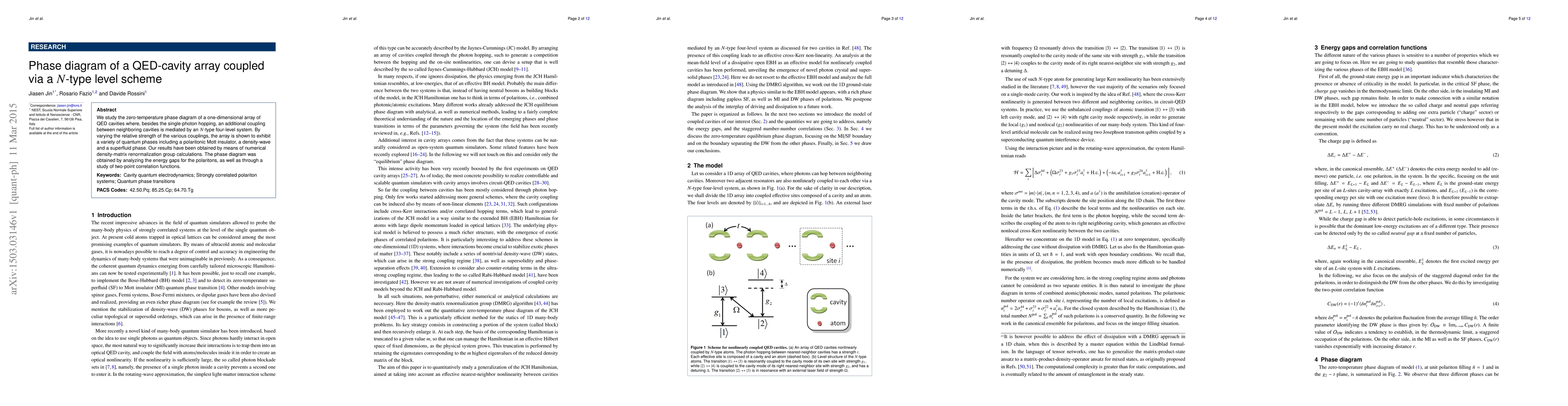 We study the zero-temperature phase diagram of a one-dimensional array of QED cavities where, besides the single-photon hopping, an additional coupling between neighboring cavities is mediated by an N-type four-level system. By varying the relative strength of the various couplings, the array is shown to exhibit a variety of quantum phases including a polaritonic Mott insulator, a density-wave and a superfluid phase. Our results have been obtained by means of numerical density-matrix renormalization group calculations. The phase diagram was obtained by analyzing the energy gaps for the polaritons, as well as through a study of two-point correlation functions.