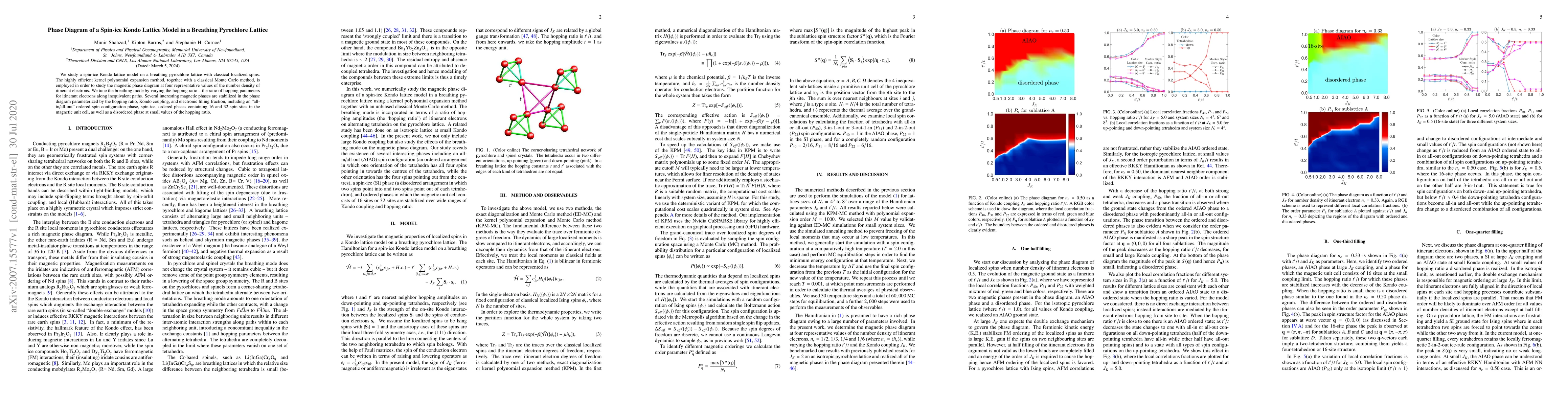 This research investigates a spin-ice Kondo lattice model on a breathing pyrochlore lattice using a kernel polynomial expansion and Monte Carlo methods, revealing several magnetic phases including ordered spin configurations, spin-ice, and disordered states, parameterized by the hopping ratio and Kondo coupling.