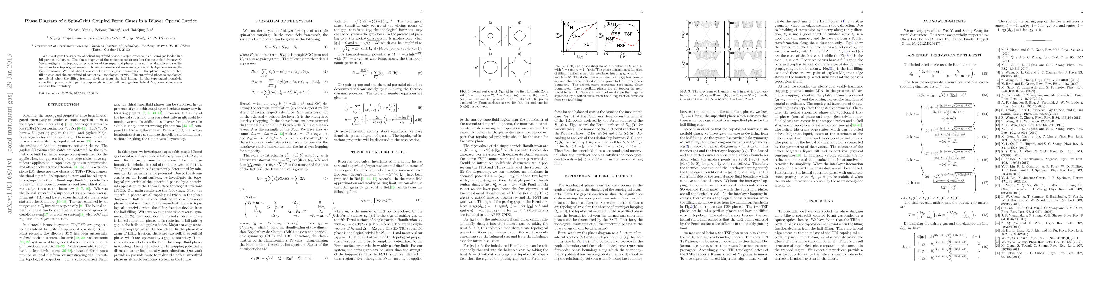 We investigate the stability of helical superfluid phase in a spin-orbit coupled Fermi gas loaded in a bilayer optical lattice. The phase diagram of the system is constructed in the mean field framework. We investigate the topological properties of the superfluid phases by a nontrivial application of the Fermi surface topological invariant to our time-reversal invariant system with degeneracies on the Fermi surface. We find that there is a first-order phase boundary in the phase diagram of half filling case and the superfluid phases are all topological trivial. The superfluid phase is topological nontrivial when the filling fraction deviates from the half filling. In the topological nontrivial superfluid phase, a full pairing gap exists in the bulk and gapless helical Majorana edge states exist at the boundary.