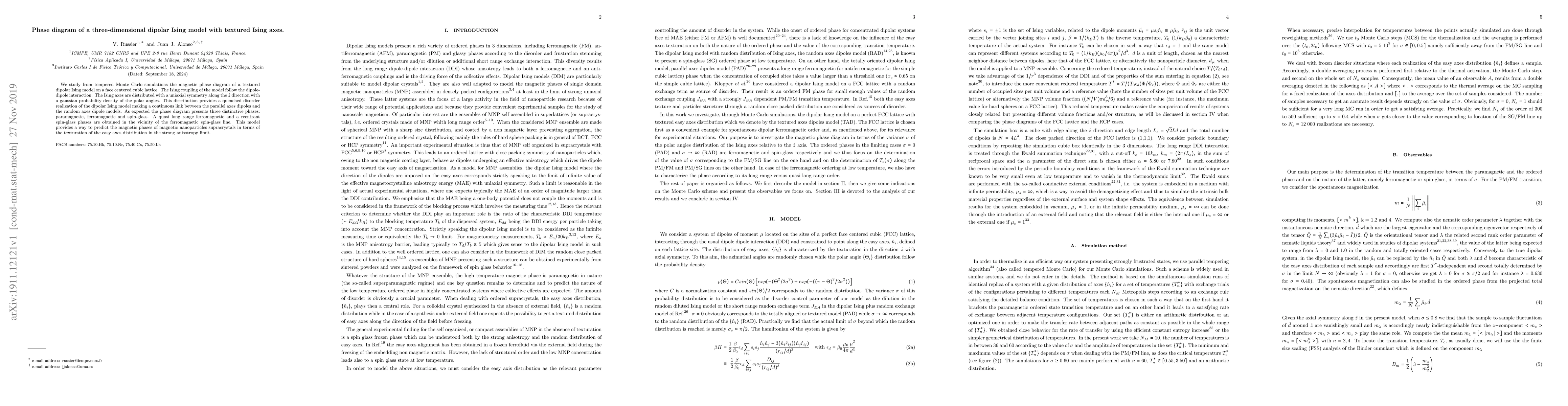 This paper uses Monte Carlo simulations to study the magnetic phase diagram of a textured dipolar Ising model on a face-centered cubic lattice, revealing three phases: paramagnetic, ferromagnetic, and spin-glass, with quasi long range ferromagnetism and reentrant spin-glass phases near the ferromagnetic spin-glass line. The model helps predict magnetic phases of nanoparticle supracrystals based on the distribution of easy axes.