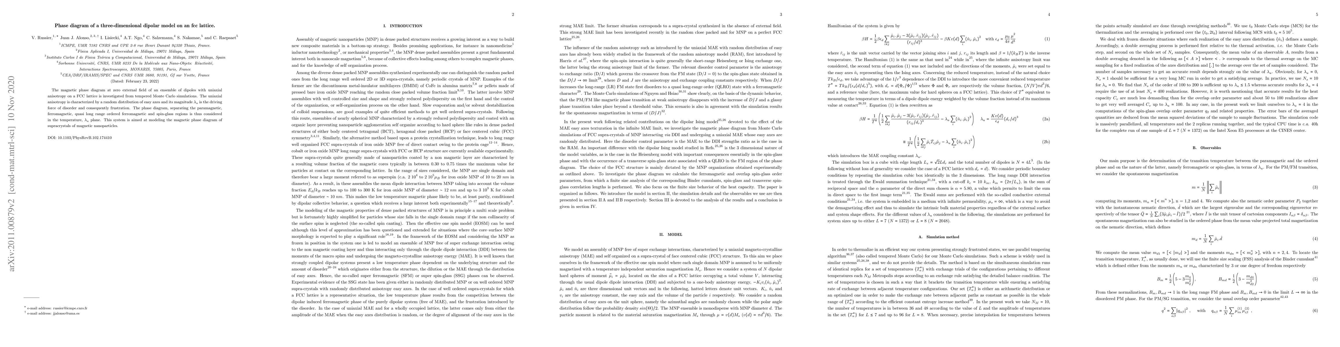 The magnetic phase diagram at zero external field of an ensemble of dipoles with uniaxial anisotropy on a FCC lattice is investigated from tempered Monte Carlo simulations. The uniaxial anisotropy is characterized by a random distribution of easy axes and its magnitude $\lambda_u$ is the driving force of disorder and consequently frustration. The phase diagram, separating the paramagnetic, ferromagnetic, quasi long range ordered ferromagnetic and spin-glass regions is thus considered in the temperature, $\lambda_u$ plane. This system is aimed at modeling the magnetic phase diagram of supracrystals of magnetic nanoparticles.