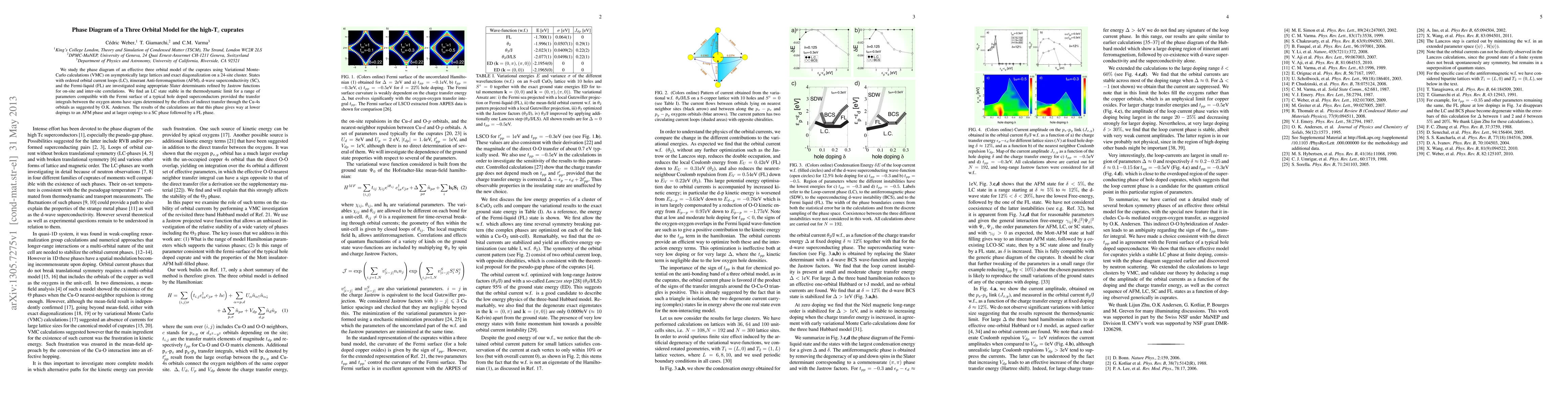 We study the phase diagram of an effective three orbital model of the cuprates using Variational Monte-Carlo calculations (VMC) on asymptotically large lattices and exact diagonalization on a 24-site cluster. States with ordered orbital current loops (LC), itinerant Anti-ferromagnetism (AFM), d-wave superconductivity (SC), and the Fermi-liquid (FL) are investigated using appropriate Slater determinants refined by Jastrow functions for on-site and inter-site correlations. We find an LC state stable in the thermodynamic limit for a range of parameters compatible with the Fermi surface of a typical hole doped superconductors provided the transfer integrals between the oxygen atoms have signs determined by the effects of indirect transfer through the Cu-4s orbitals as suggested by O.K. Andersen. The results of the calculations are that this phase gives way at lower dopings to an AFM phase and at larger copings to a SC phase followed by a FL phase.