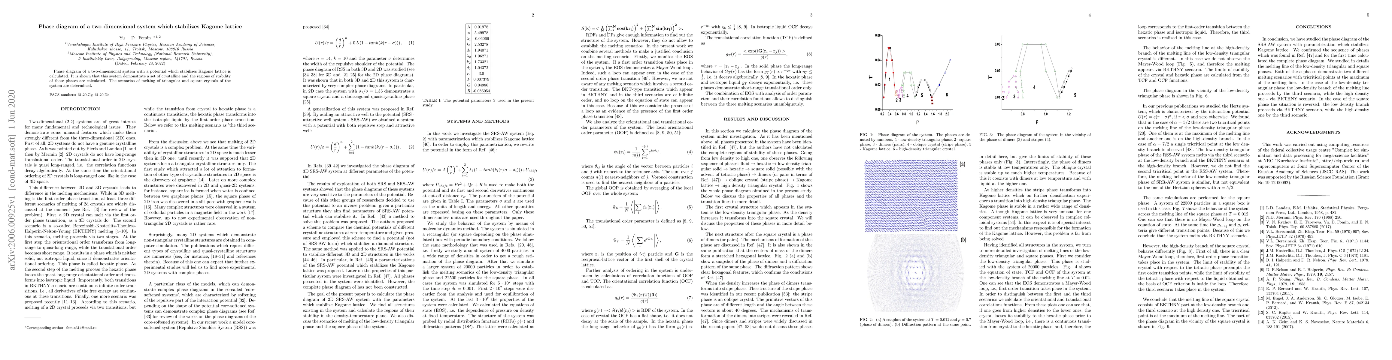 This research calculates the phase diagram of a two-dimensional system that stabilizes a Kagome lattice, identifying regions of stability for crystalline phases and determining scenarios for melting of triangular and square crystals.