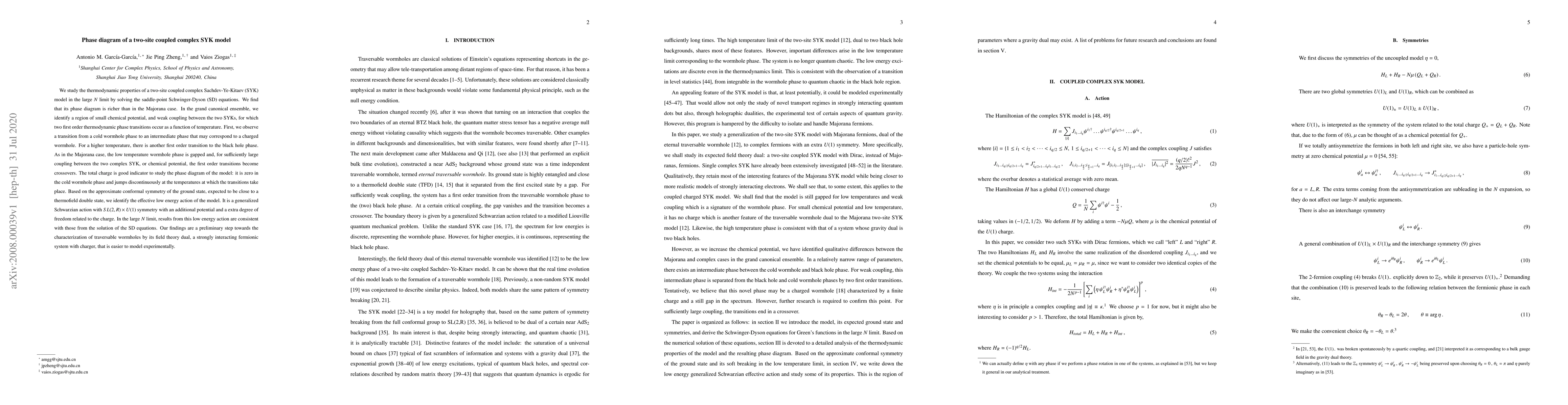 The paper studies a two-site coupled Sachdev-Ye-Kitaev model, finding multiple phase transitions as temperature changes, with implications for understanding traversable wormholes in a field theory dual system.