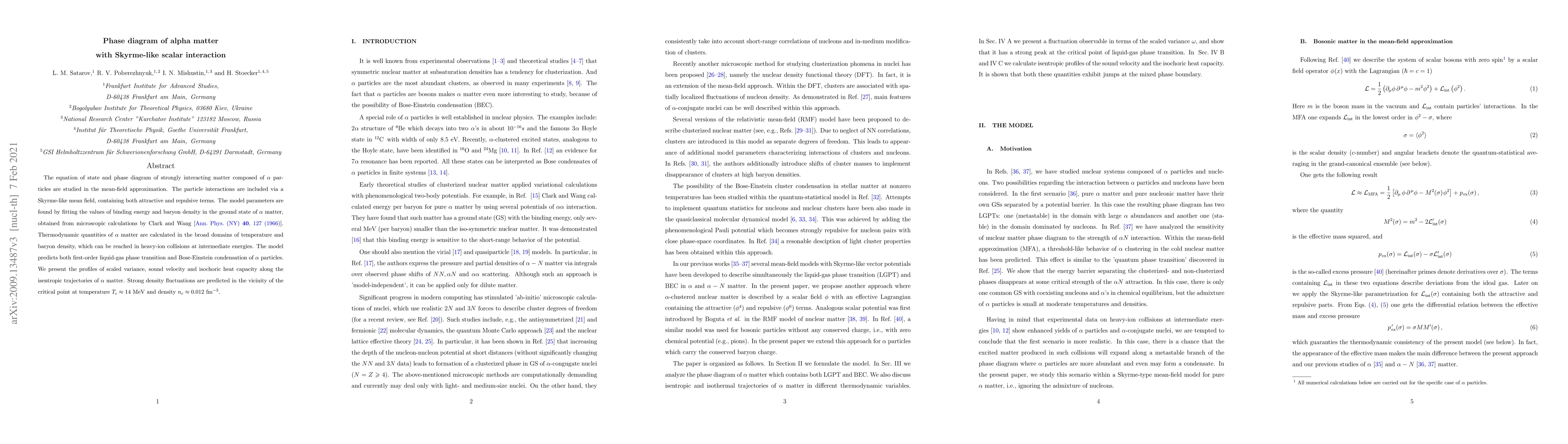 The equation of state and phase diagram of strongly interacting matter composed of $\alpha$ particles are studied in the mean-field approximation. The particle interactions are included via a Skyrme-like mean field, containing both attractive and repulsive terms. The model parameters are found by fitting known values of binding energy and baryon density in the ground state of $\alpha$ matter, obtained from microscopic calculations by Clark and Wang. Thermodynamic quantities of $\alpha$ matter are calculated in the broad domains of temperature and baryon density, which can be reached in heavy-ion collisions at intermediate energies. The model predicts both first-order liquid-gas phase transition and Bose-Einstein condensation of $\alpha$ particles. We present the profiles of scaled variance, sound velocity and isochoric heat capacity along the isentropic trajectories of $\alpha$ matter. Strong density fluctuations are predicted in the vicinity of the critical point at temperature $T_c\approx 14~\textrm{MeV}$ and density $n_c\approx 0.012~\textrm{fm}^{-3}$.