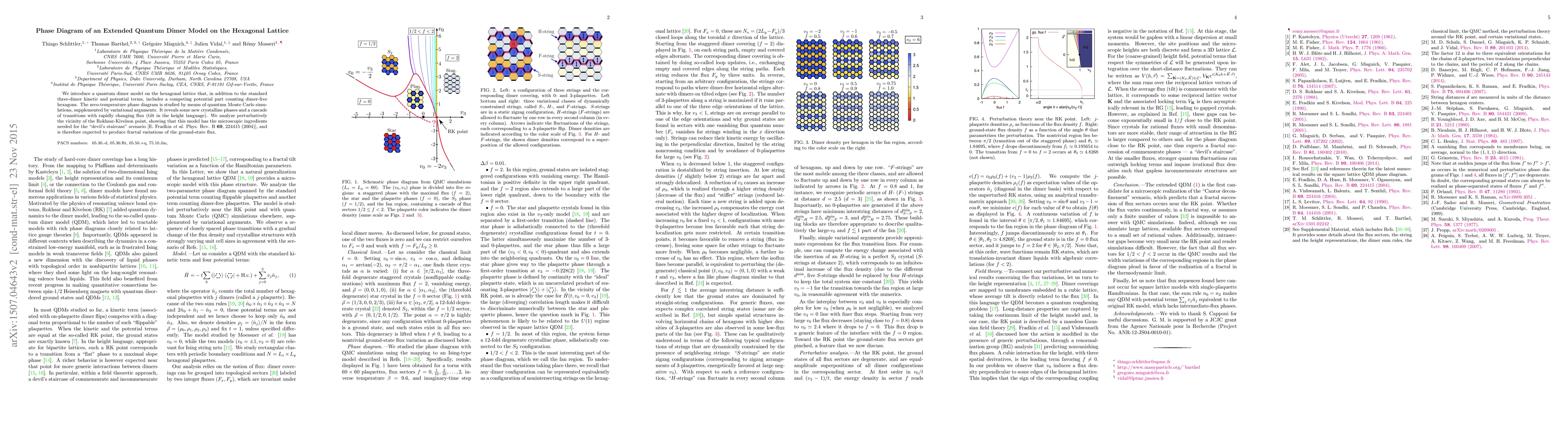 This paper explores an extended quantum dimer model on a hexagonal lattice, introducing a competing potential for dimer-free hexagons. Quantum Monte Carlo simulations reveal new crystalline phases and a complex transition structure, with fractal variations in ground-state flux near the Rokhsar-Kivelson point.
