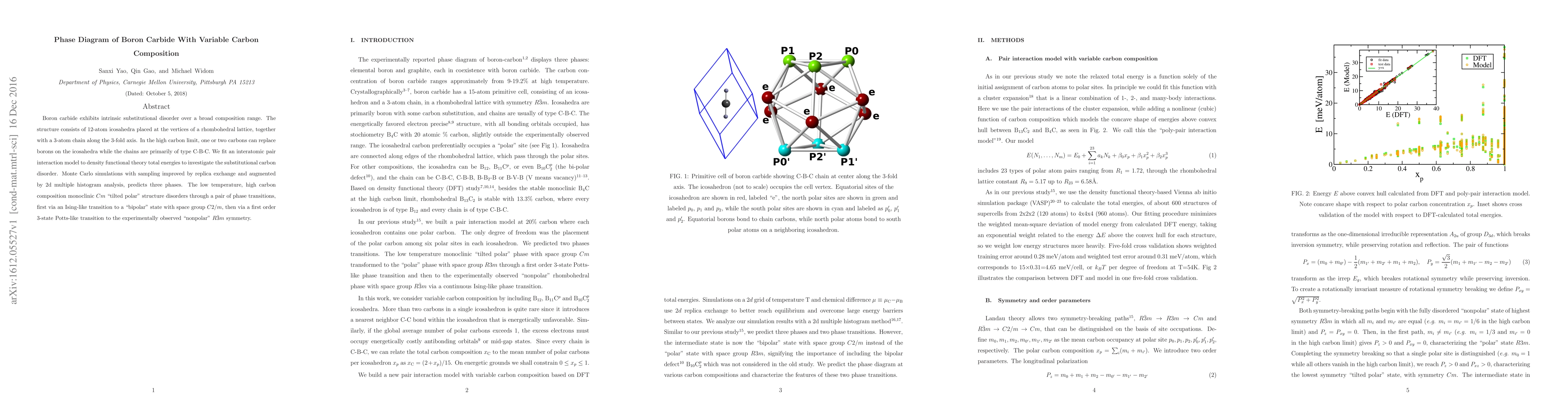 This study investigates the phase diagram of boron carbide with variable carbon composition, revealing three distinct phases through Monte Carlo simulations. The research identifies a low-temperature, high-carbon monoclinic phase that undergoes two phase transitions, transitioning first to a bipolar state and then to a nonpolar phase.
