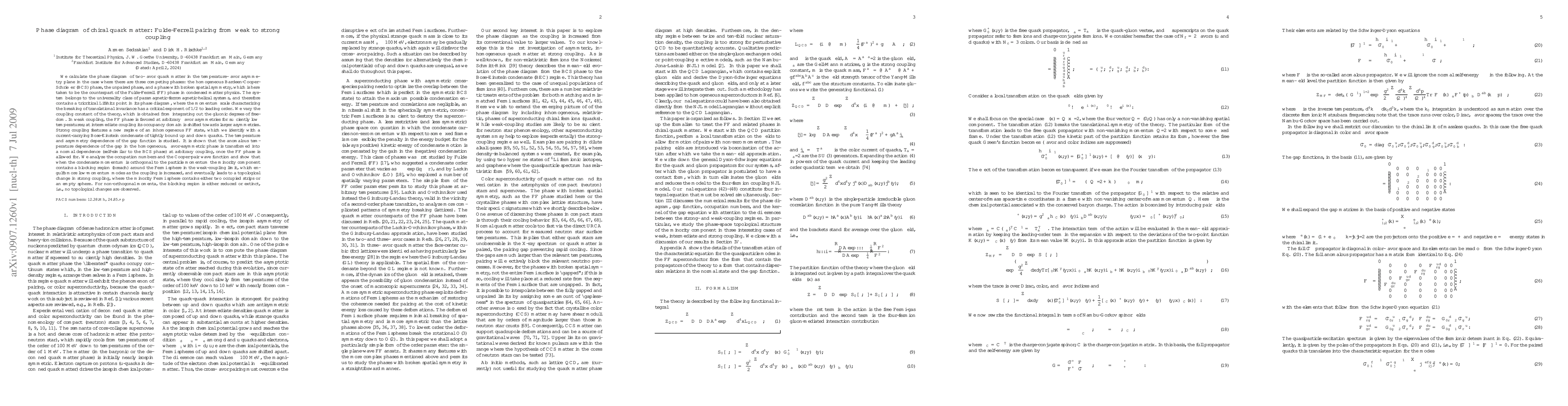 We calculate the phase diagram of two-flavor quark matter in the temperature-flavor asymmetry plane in the case where there are three competing phases: the homogeneous Bardeen-Cooper-Schrieffer (BCS) phase, the unpaired phase, and a phase with broken spatial symmetry, which is here taken to be the counterpart of the Fulde-Ferrell (FF) phase in condensed matter physics. We show that the system belongs to the universality class of paramagnetic-ferromagnetic -helical systems. We vary the coupling constant of the theory, which is obtained from integrating out the gluonic degrees of freedom. In weak coupling, the FF phase is favored at arbitrary flavor asymmetries for sufficiently low temperatures; at intermediate coupling its occupancy domain is shifted towards larger asymmetries. Strong coupling features a new regime of an inhomogeneous FF state, which we identify with a current-carrying Bose-Einstein condensate of tightly bound up and down quarks. We analyze the occupation numbers and the Cooper-pair wave function and show that when the condensate momentum is orthogonal to the particle momentum the minority component contains a blocking region (breach) around the Fermi sphere in the weak-coupling limit, which engulfs more low-momentum modes as the coupling is increased, and eventually leads to a topological change in strong coupling, where the minority Fermi sphere contains either two occupied strips or an empty sphere. For non-orthogonal momenta, the blocking region is either reduced or extinct, i.e., no topological changes are observed.