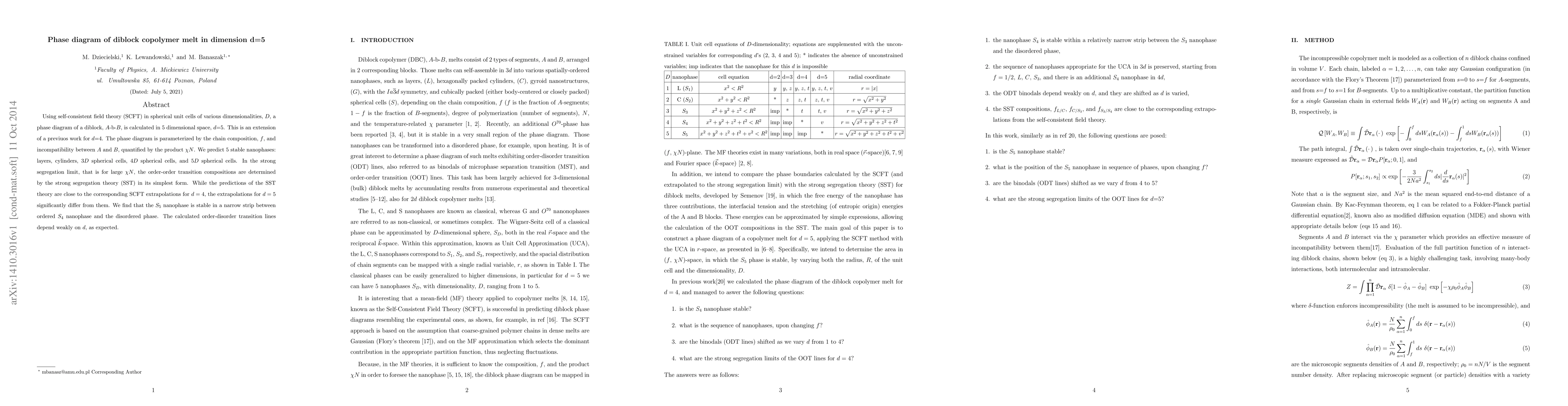 Using the self-consistent field theory (SCFT) in spherical unit cells of various dimensionalities, D, a phase diagram of a diblock, A-b-B, is calculated in 5 dimensional space, d = 5. This is an extension of a previous work for d = 4. The phase diagram is parameterized by the chain composition, f, and incompatibility between A and B , quantified by the product \c{hi} N. We predict 5 stable nanophases: layers, cylinders, 3 D spherical cells, 4D spherical cells, and 5D spherical cells. In the strong segregation limit, that is for large \c{hi}N, the order-order transition compositions are determined by the strong segregation theory (SST) in its simplest form. While the predictions of the SST theory are close to the corresponding SCFT extrapolations for d=4, the extrapolations for d=5 significantly differ from them. We find that the S5 nanophase is stable in a narrow strip between the ordered S4 nanophase and the disordered phase. The calculated order-disorder transition lines depend weakly on d, as expected.