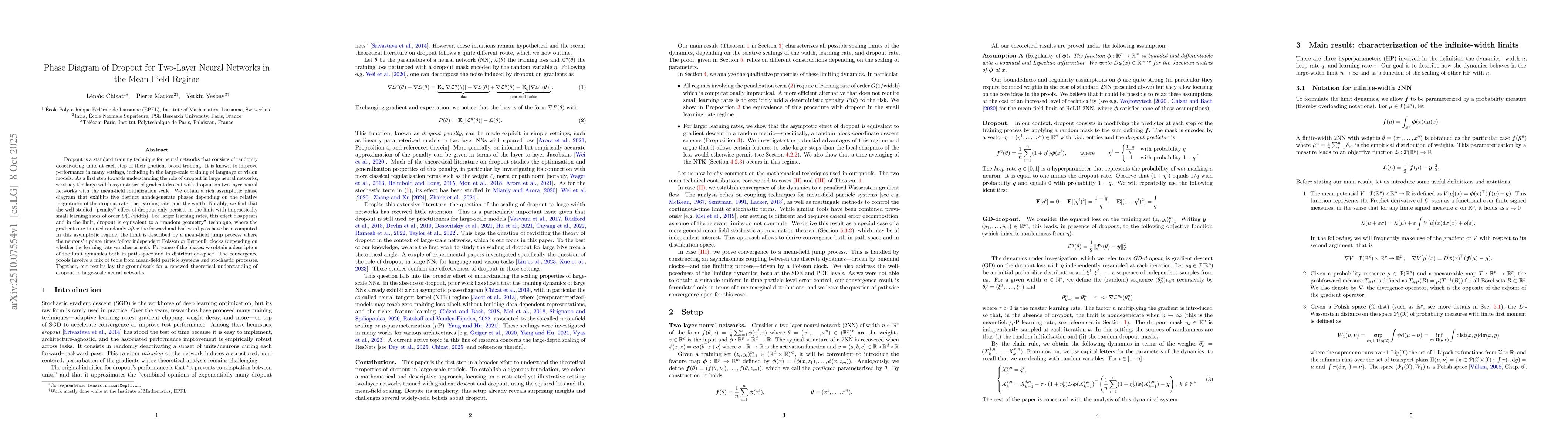 Dropout is a standard training technique for neural networks that consists of randomly deactivating units at each step of their gradient-based training. It is known to improve performance in many settings, including in the large-scale training of language or vision models. As a first step towards understanding the role of dropout in large neural networks, we study the large-width asymptotics of gradient descent with dropout on two-layer neural networks with the mean-field initialization scale. We obtain a rich asymptotic phase diagram that exhibits five distinct nondegenerate phases depending on the relative magnitudes of the dropout rate, the learning rate, and the width. Notably, we find that the well-studied "penalty" effect of dropout only persists in the limit with impractically small learning rates of order $O(1/\text{width})$. For larger learning rates, this effect disappears and in the limit, dropout is equivalent to a "random geometry" technique, where the gradients are thinned randomly after the forward and backward pass have been computed. In this asymptotic regime, the limit is described by a mean-field jump process where the neurons' update times follow independent Poisson or Bernoulli clocks (depending on whether the learning rate vanishes or not). For some of the phases, we obtain a description of the limit dynamics both in path-space and in distribution-space. The convergence proofs involve a mix of tools from mean-field particle systems and stochastic processes. Together, our results lay the groundwork for a renewed theoretical understanding of dropout in large-scale neural networks.