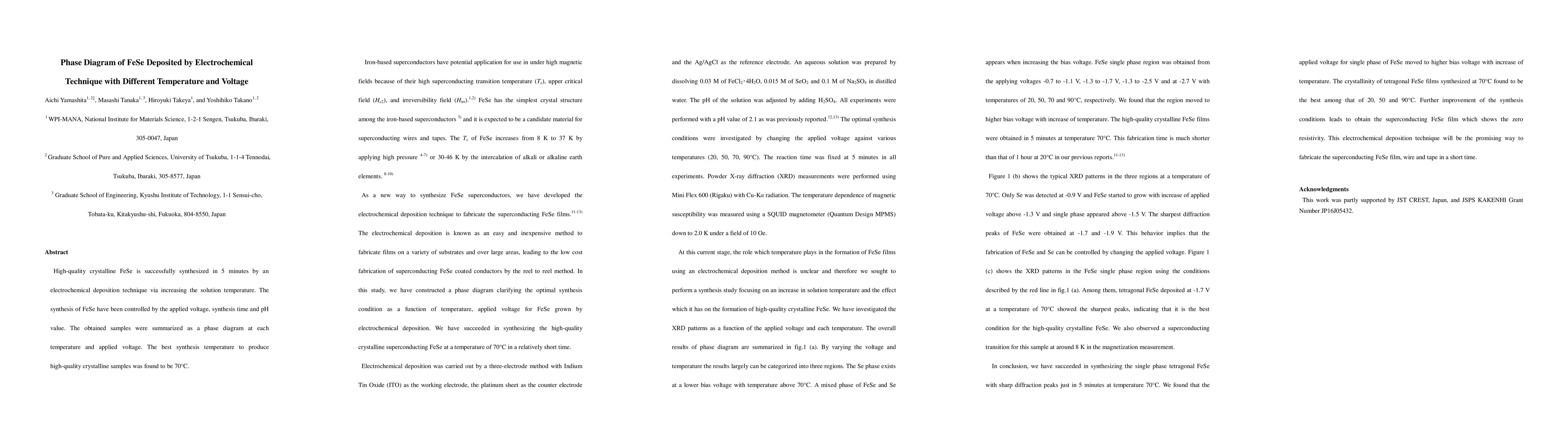 High-quality crystalline FeSe is successfully synthesized in 5 minutes by an electrochemical deposition technique via increasing the solution temperature. The synthesis of FeSe have been controlled by the applied voltage, synthesis time and pH value. The obtained samples were summarized as a phase diagram at each temperature and applied voltage. The best synthesis temperature to produce high-quality crystalline samples was found to be 70{\deg}C.