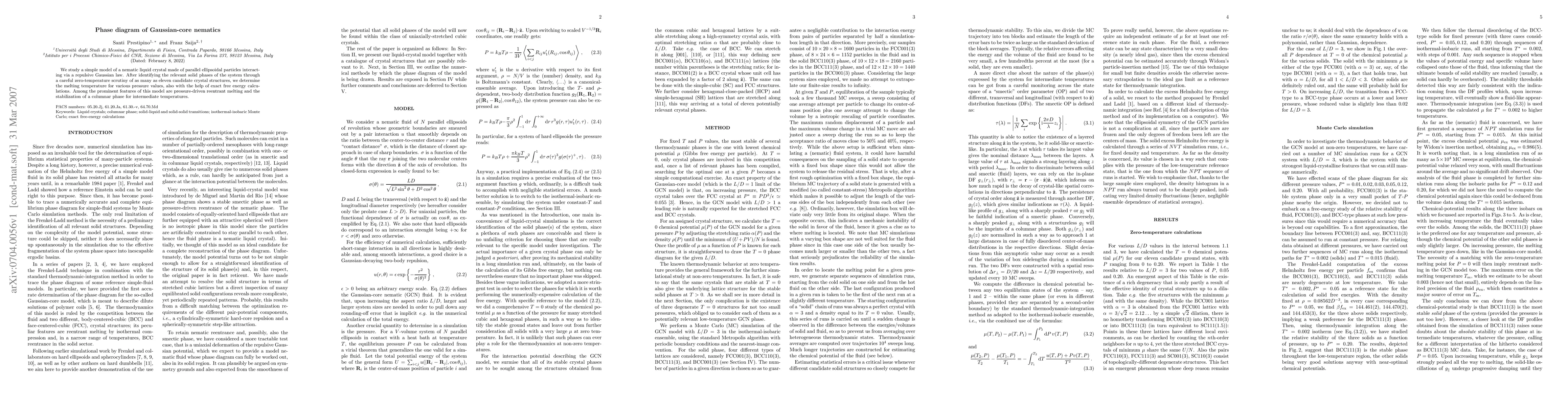 This paper investigates a Gaussian-core nematic liquid crystal model, identifying solid phases and determining melting temperatures under various pressures. Notable findings include pressure-induced reentrant melting and the emergence of a columnar phase at intermediate temperatures.