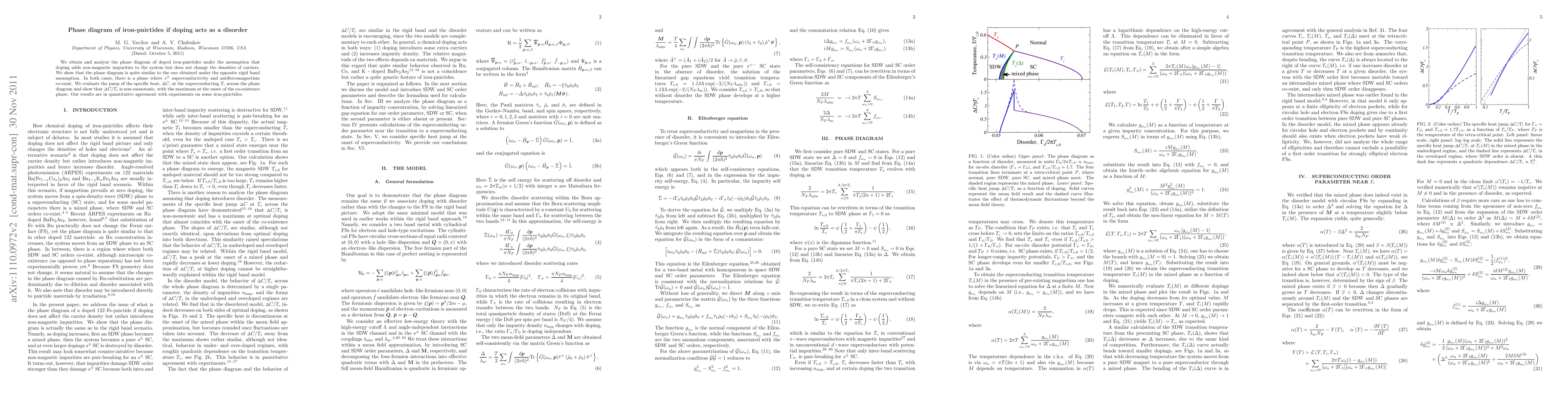 We obtain and analyze the phase diagram of doped iron-pnictides under the assumption that doping adds non-magnetic impurities to the system but does not change the densities of carriers. We show that the phase diagram is quite similar to the one obtained under the opposite rigid band assumption. In both cases, there is a phase where extended s+- superconductivity and antiferromagnetism co-exist. We evaluate the jump of the specific heat at the superconducting transition across the phase diagram and show that the jump is non-monotonic, with the maximum at the onset of the co-existence phase. Our results are in quantitative agreement with experiments on some iron-pnictides.