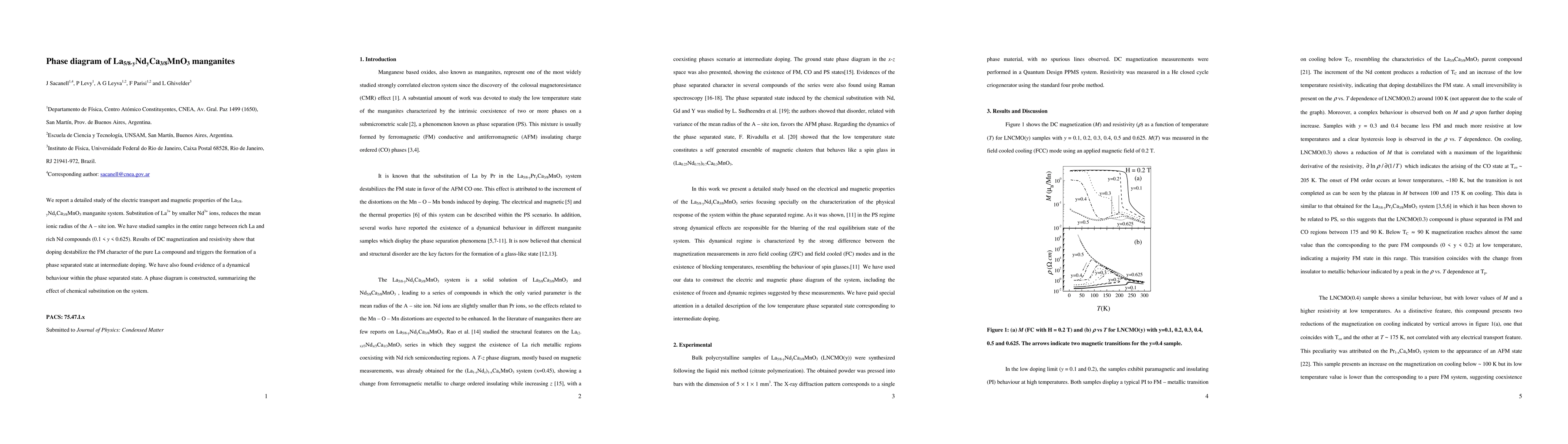 We report a detailed study of the electric transport and magnetic properties of the LaNdCaMnO manganite system. Substitution of LaIII by smaller NdIII ions, reduces the mean ionic radius of the A site ion. We have studied samples in the entire range between rich La and rich Nd compounds. Results of DC magnetization and resistivity show that doping destabilize the FM character of the pure La compound and triggers the formation of a phase separated state at intermediate doping. We have also found evidence of a dynamical behaviour within the phase separated state. A phase diagram is constructed, summarizing the effect of chemical substitution on the system.