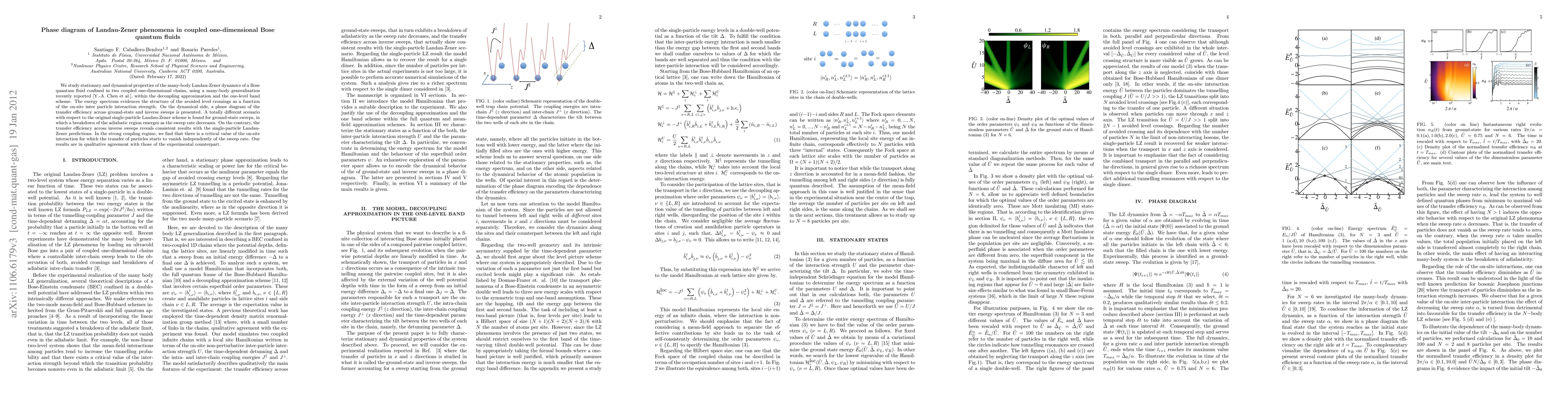 We study stationary and dynamical properties of the many-body Landau-Zener dynamics of a Bose quantum fluid confined in two coupled one-dimensional chains, using a many-body generalization recently reported [Y.-A. Chen et al.], within the decoupling approximation and the one-level band scheme. The energy spectrum evidences the structure of the avoided level crossings as a function of the on-site inter particle interaction strength. On the dynamical side, a phase diagram of the transfer efficiency across ground-state and inverse sweeps is presented. A totally different scenario with respect to the original single-particle Landau-Zener scheme is found for ground-state sweeps, in which a breakdown of the adiabatic region emerges as the sweep rate decreases. On the contrary, the transfer efficiency across inverse sweeps reveals consistent results with the single-particle Landau-Zener predictions. In the strong coupling regime, we find that there is a critical value of the on-site interaction for which the transfer of particles starts to vanish independently of the sweep rate. Our results are in qualitative agreement with those of the experimental counterpart.