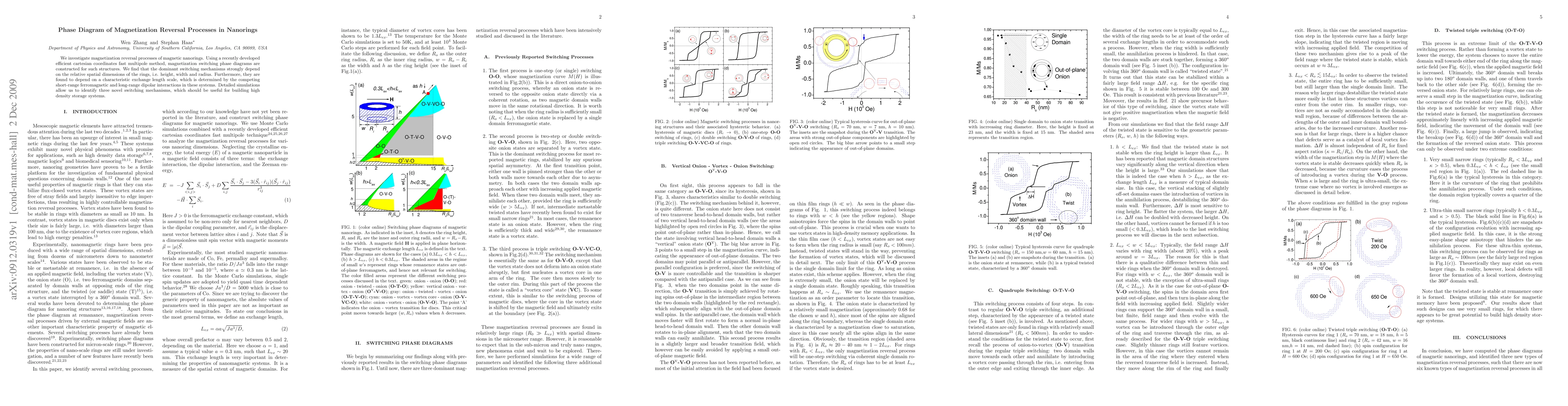 This study constructs magnetization switching phase diagrams for magnetic nanorings using a fast multipole method, revealing that the dominant reversal mechanisms depend on the ring's dimensions and a characteristic exchange length scale influenced by ferromagnetic and dipolar interactions. Three novel switching mechanisms identified could aid in developing high-density storage systems.