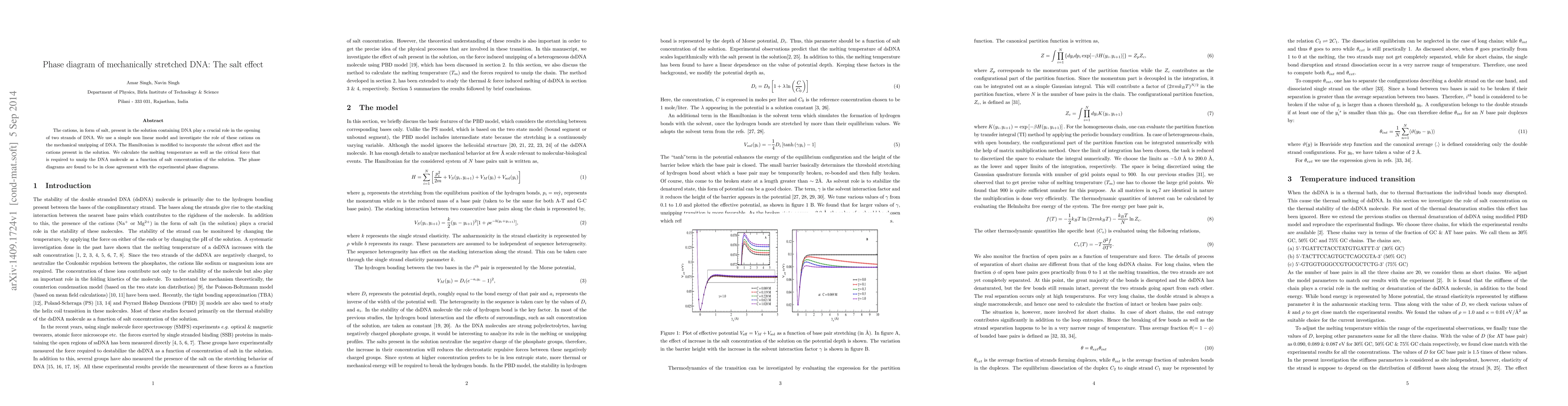 The cations, in form of salt, present in the solution containing DNA play a crucial role in the opening of two strands of DNA. We use a simple non linear model and investigate the role of these cations on the mechanical unzipping of DNA. The Hamiltonian is modified to incoporate the solvent effect and the cations present in the solution. We calculate the melting temperature as well as the critical force that is required to unzip the DNA molecule as a function of salt concentration of the solution. The phase diagrams are found to be in close agreement with the experimental phase diagrams.