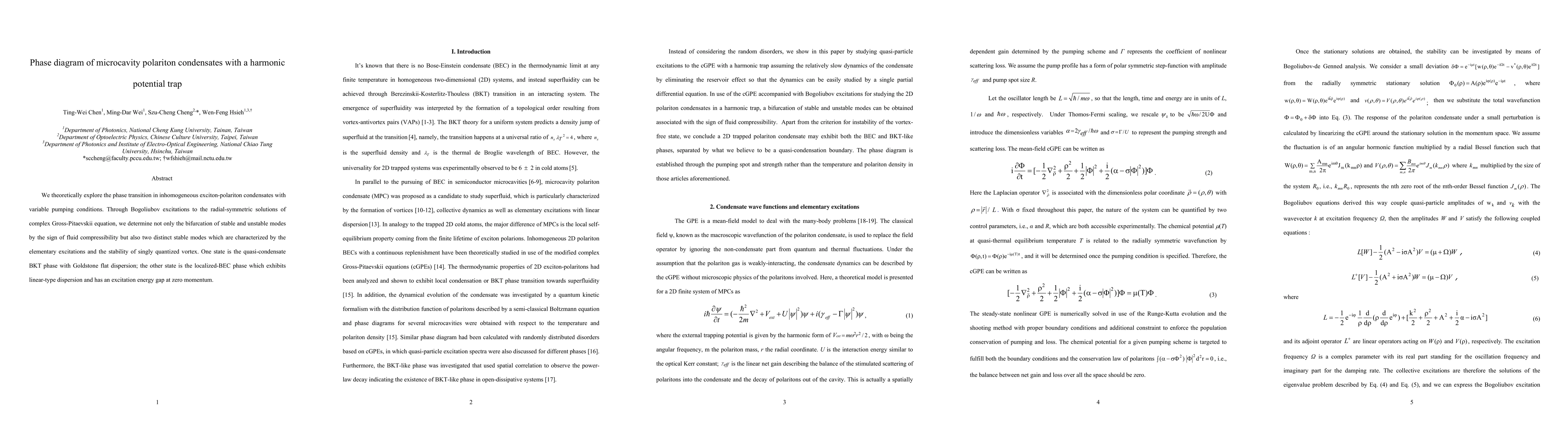 We theoretically explore the phase transition in inhomogeneous exciton-polariton condensates with variable pumping conditions. Through Bogoliubov excitations to the radial-symmetric solutions of complex Gross-Pitaevskii equation, we determine not only the bifurcation of stable and unstable modes by the sign of fluid compressibility but also two distinct stable modes which are characterized by the elementary excitations and the stability of singly quantized vortex. One state is the quasi-condensate BKT phase with Goldstone flat dispersion; the other state is the localized-BEC phase which exhibits linear-type dispersion and has an excitation energy gap at zero momentum.