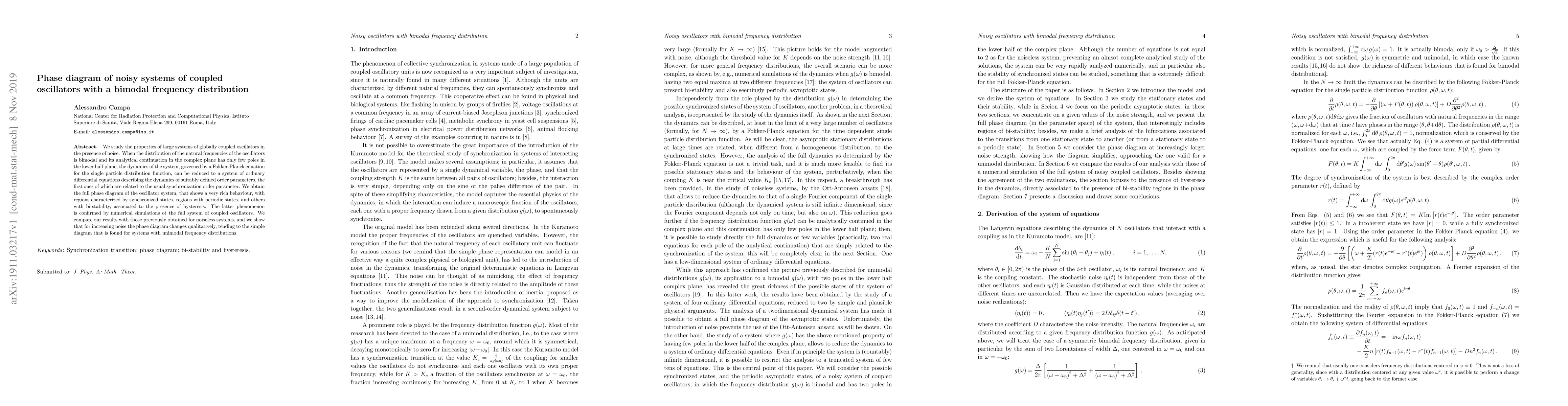This paper investigates the phase diagram of noisy systems of globally coupled oscillators with a bimodal frequency distribution. It reveals complex dynamics, including synchronized, periodic, and bistable states, and shows how noise alters the phase diagram compared to noiseless systems.