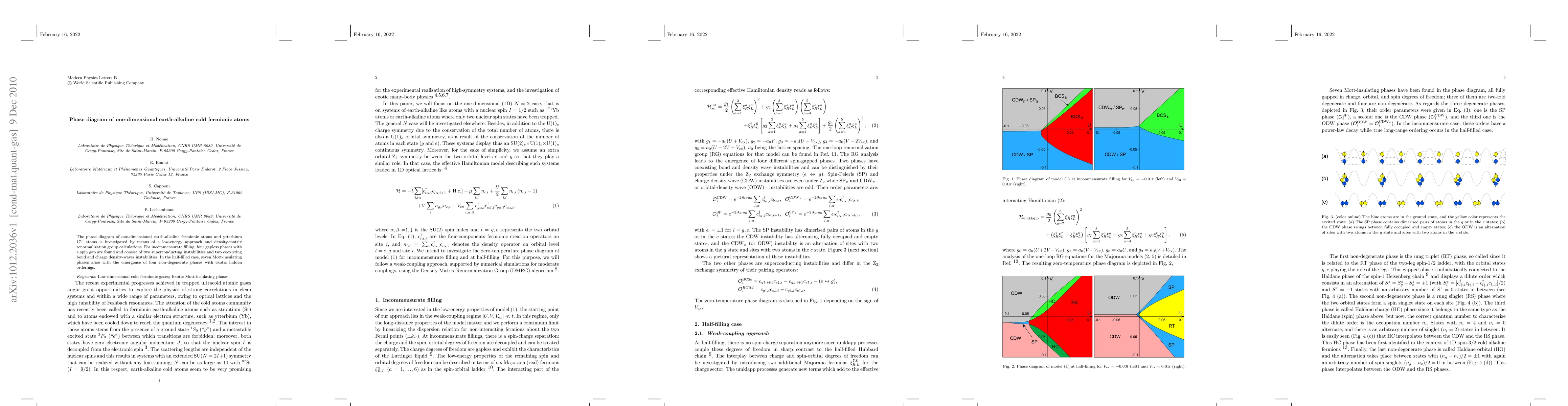 The phase diagram of one-dimensional earth-alkaline fermionic atoms and ytterbium 171 atoms is investigated by means of a low-energy approach and density-matrix renormalization group calculations. For incommensurate filling, four gapless phases with a spin gap are found and consist of two superconducting instabilities and two coexisting bond and charge density-waves instabilities. In the half-filled case, seven Mott-insulating phases arise with the emergence of four non-degenerate phases with exotic hidden orderings.