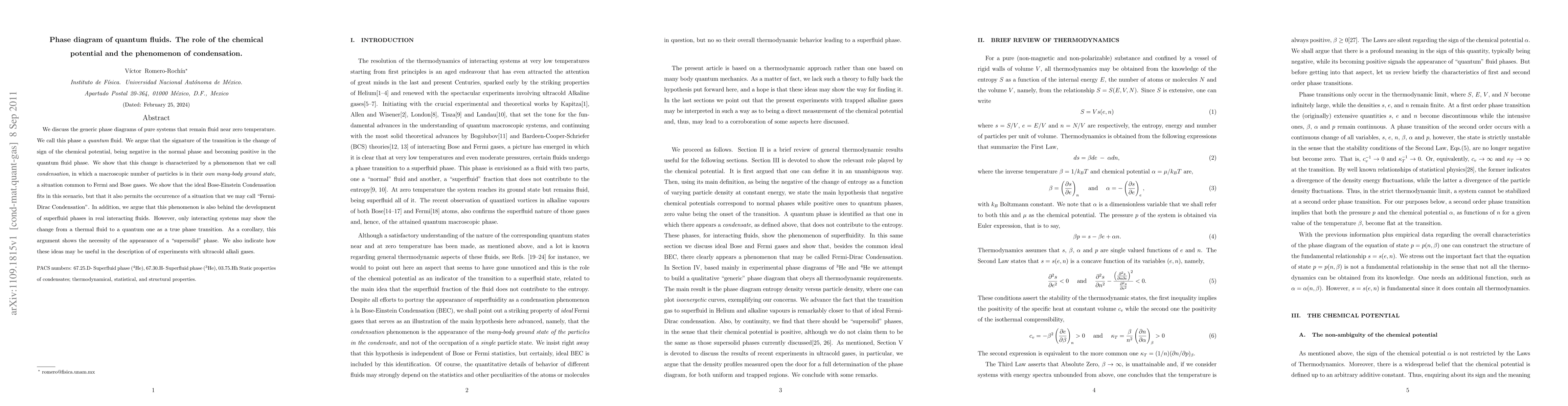 We discuss the generic phase diagrams of pure systems that remain fluid near zero temperature. We call this phase a quantum fluid. We argue that the signature of the transition is the change of sign of the chemical potential, being negative in the normal phase and becoming positive in the quantum fluid phase. We show that this change is characterized by a phenomenon that we call condensation, in which a macroscopic number of particles is in their own many-body ground state, a situation common to Fermi and Bose gases. We show that the ideal Bose-Einstein Condensation fits in this scenario, but that it also permits the occurrence of a situation that we may call "Fermi-Dirac Condensation". In addition, we argue that this phenomenon is also behind the development of superfluid phases in real interacting fluids. However, only interacting systems may show the change from a thermal fluid to a quantum one as a true phase transition. As a corollary, this argument shows the necessity of the appearance of a "supersolid" phase. We also indicate how these ideas may be useful in the description of of experiments with ultracold alkali gases.