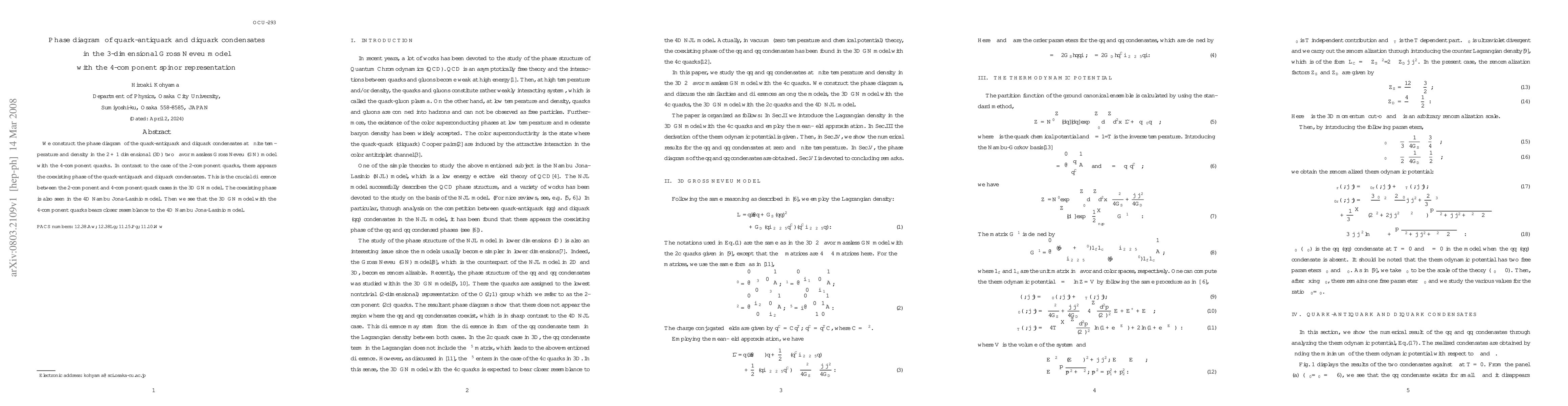 Researchers created a phase diagram for quark-antiquark and diquark condensates in a 3D model with 4-component spinor representation, finding a coexisting phase that resembles the 4D Nambu Jona-Lasinio model.