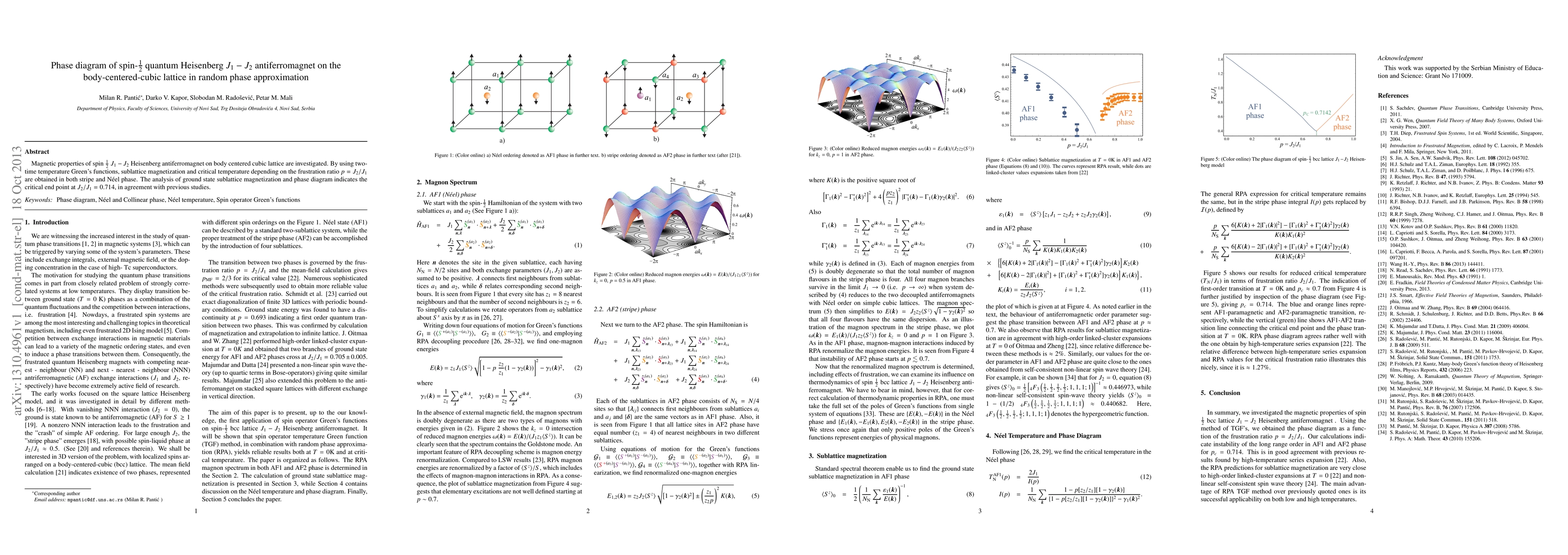 Magnetic properties of spin $\frac 12$ $J_1-J_2$ Heisenberg antiferromagnet on body centered cubic lattice are investigated. By using two-time temperature Green's functions, sublattice magnetization and critical temperature depending on the frustration ratio $p=J_2/J_1$ are obtained in both stripe and N\'eel phase. The analysis of ground state sublattice magnetization and phase diagram indicates the critical end point at $J_2/J_1 =0.714$, in agreement with previous studies.