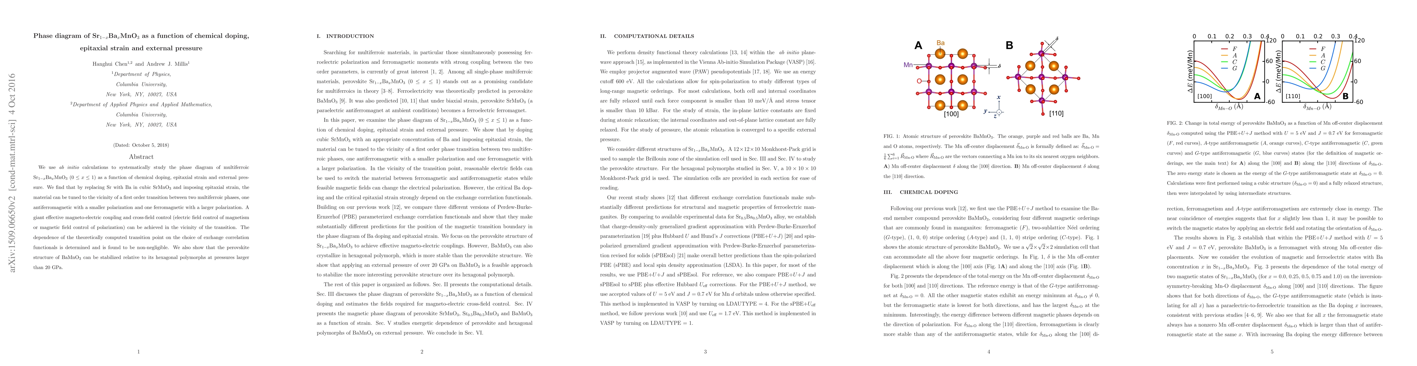 This study uses \textit{ab initio} calculations to explore the phase diagram of Sr$_{1-x}$Ba$_x$MnO$_3$ under chemical doping, epitaxial strain, and pressure. The research reveals that tuning SrMnO$_3$ with Ba and applying strain can induce a transition between antiferromagnetic and ferromagnetic multiferroic phases, achieving strong magneto-electric coupling.