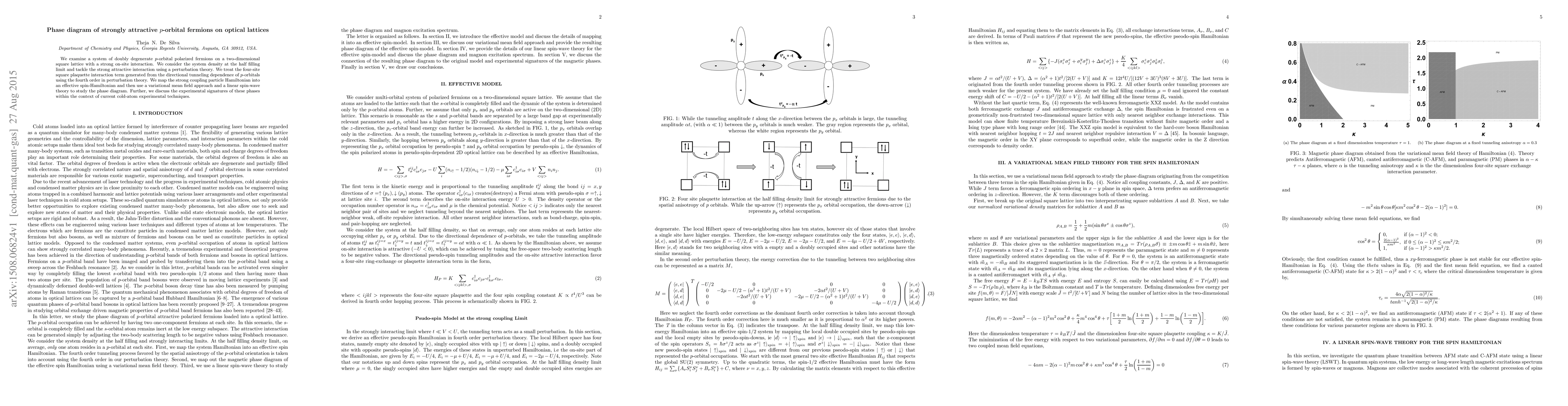 This research investigates a system of strongly interacting, doubly degenerate p-orbital fermions on a 2D square lattice. By treating attractive interactions perturbatively and mapping the system into an effective spin-Hamiltonian, the authors derive the phase diagram using mean field and linear spin-wave theory. They also discuss potential experimental observations with cold atoms.