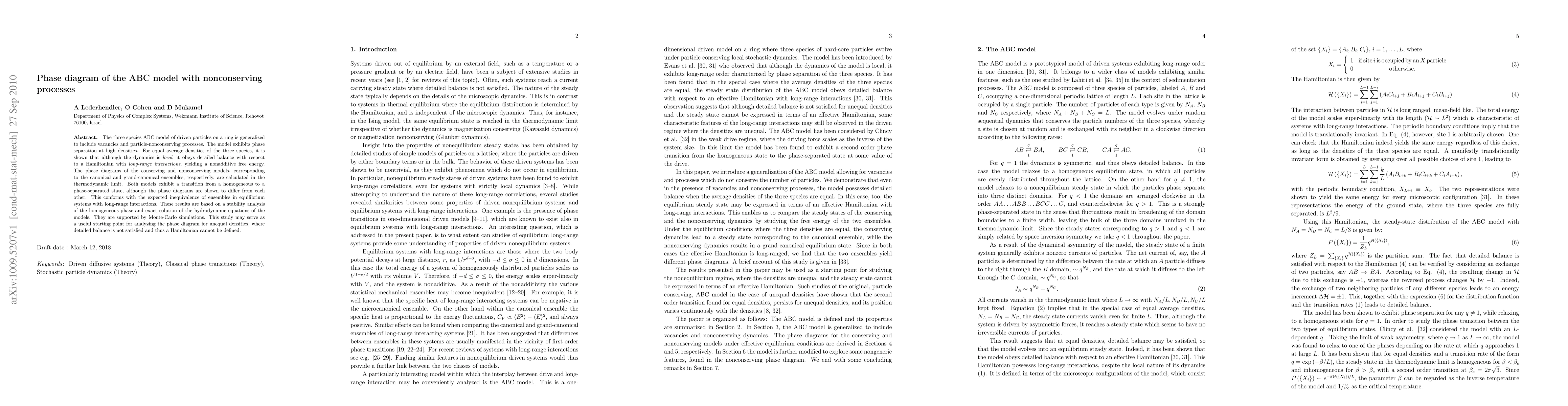 The three species ABC model of driven particles on a ring is generalized to include vacancies and particle-nonconserving processes. The model exhibits phase separation at high densities. For equal average densities of the three species, it is shown that although the dynamics is {\it local}, it obeys detailed balance with respect to a Hamiltonian with {\it long-range interactions}, yielding a nonadditive free energy. The phase diagrams of the conserving and nonconserving models, corresponding to the canonical and grand-canonical ensembles, respectively, are calculated in the thermodynamic limit. Both models exhibit a transition from a homogeneous to a phase-separated state, although the phase diagrams are shown to differ from each other. This conforms with the expected inequivalence of ensembles in equilibrium systems with long-range interactions. These results are based on a stability analysis of the homogeneous phase and exact solution of the hydrodynamic equations of the models. They are supported by Monte-Carlo simulations. This study may serve as a useful starting point for analyzing the phase diagram for unequal densities, where detailed balance is not satisfied and thus a Hamiltonian cannot be defined.