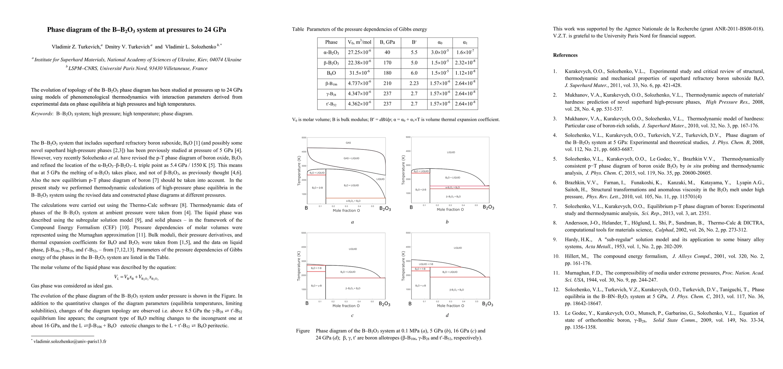 This study investigates the phase diagram of the boron-boro oxide (B-B2O3) system under pressures up to 24 GPa, employing phenomenological thermodynamics models and interaction parameters derived from high-pressure, high-temperature experimental data. The research reveals changes in the phase diagram's topology with increasing pressure.