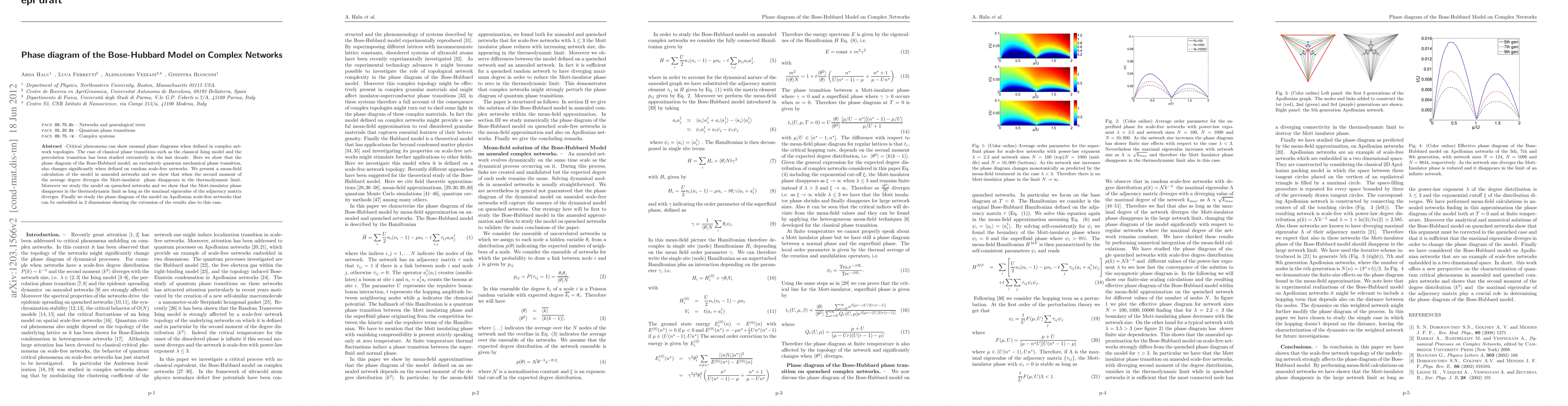 Researchers studied the Bose-Hubbard model on complex networks and found that quantum phase transitions change significantly when defined in scale-free networks. The Mott-insulator phase disappears in thermodynamic limits as long as certain network properties diverge.