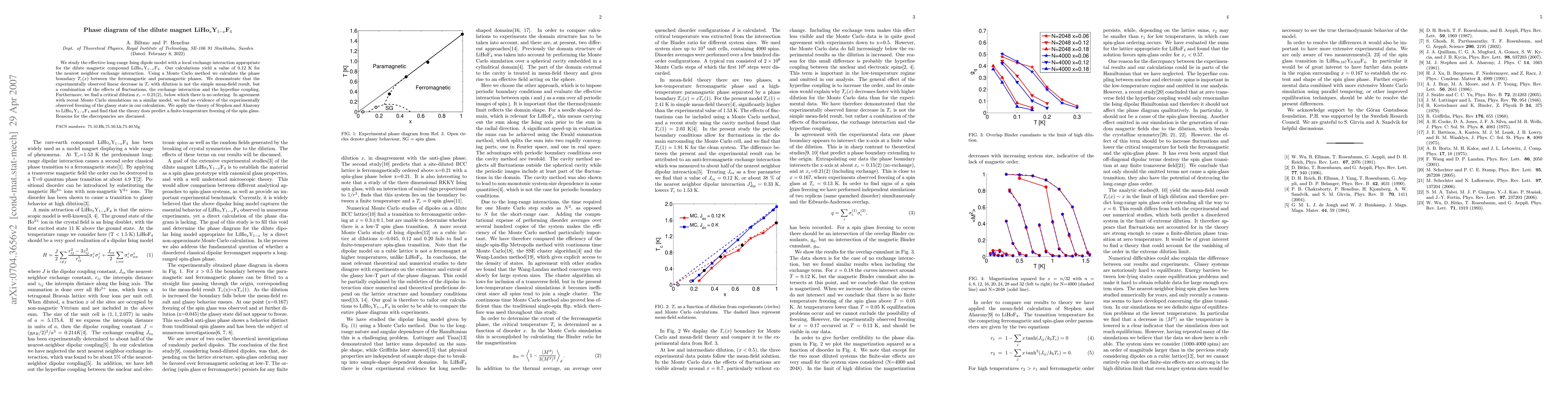We study the effective long-range Ising dipole model with a local exchange interaction appropriate for the dilute magnetic compound LiHo_{x}Y_{1-x}F_4. Our calculations yield a value of 0.12 K for the nearest neighbor exchange interaction. Using a Monte Carlo method we calculate the phase boundary T_c(x) between the ferromagnetic and paramagnetic phases. We demonstrate that the experimentally observed linear decrease in T_c with dilution is not the simple mean-field result, but a combination of the effects of fluctuations, the exchange interaction and the hyperfine coupling. Furthermore, we find a critical dilution x_c=0.21(2), below which there is no ordering. In agreement with recent Monte Carlo simulations on a similar model, we find no evidence of the experimentally observed freezing of the glassy state in our calculation. We apply the theory of Stephen and Aharony to LiHo_{x}Y_{1-x}F_4 and find that the theory does predict a finite-temperature freezing of the spin glass. Reasons for the discrepancies are discussed.