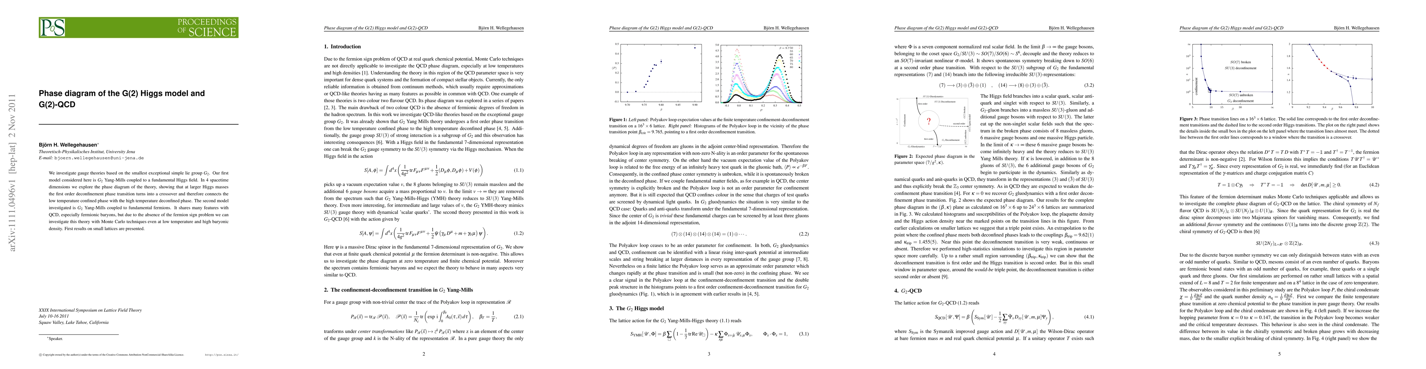 We investigate gauge theories based on the smallest exceptional simple lie group G(2). Our first model considered here is G(2) Yang-Mills coupled to a fundamental Higgs field. In 4 spacetime dimensions we explore the phase diagram of the theory, showing that at larger Higgs masses the first order deconfinement phase transition turns into a crossover and therefore connects the low temperature confined phase with the high temperature deconfined phase. The second model investigated is G(2) Yang-Mills coupled to fundamental fermions. It shares many features with QCD, especially fermionic baryons, but due to the absence of the fermion sign problem we can investigate this theory with Monte Carlo techniques even at low temperature and high baryonic density. First results on small lattices are presented.