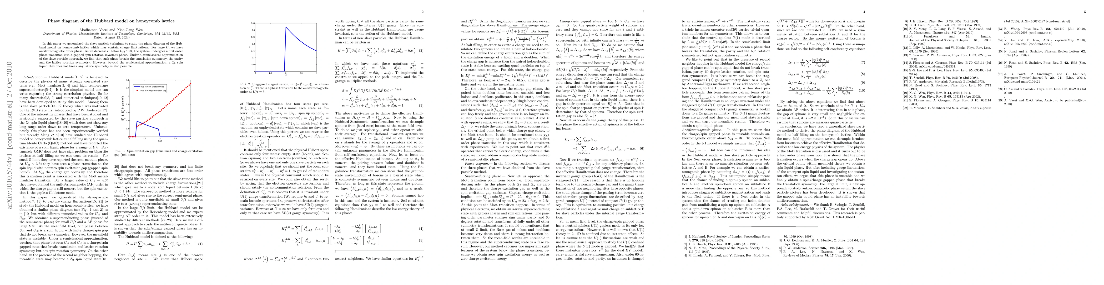 In this paper we generalized the slave-particle technique to study the phase diagram of the Hubbard model on honeycomb lattice which may contain charge fluctuations. For large $U$, we have antiferromagnetic order phase. As we decrease $U$ below $U_{c2}\simeq 3t$, the system undergoes a first order phase transition into a gapped spin rotation invariant phase. Under a semiclassical approximation of the slave-particle approach, we find that such phase breaks the translation symmetry, the parity and the lattice rotation symmetry. However, beyond the semiclassical approximation, a $Z_2$ spin liquid that does not break any lattice symmetry is also possible.
