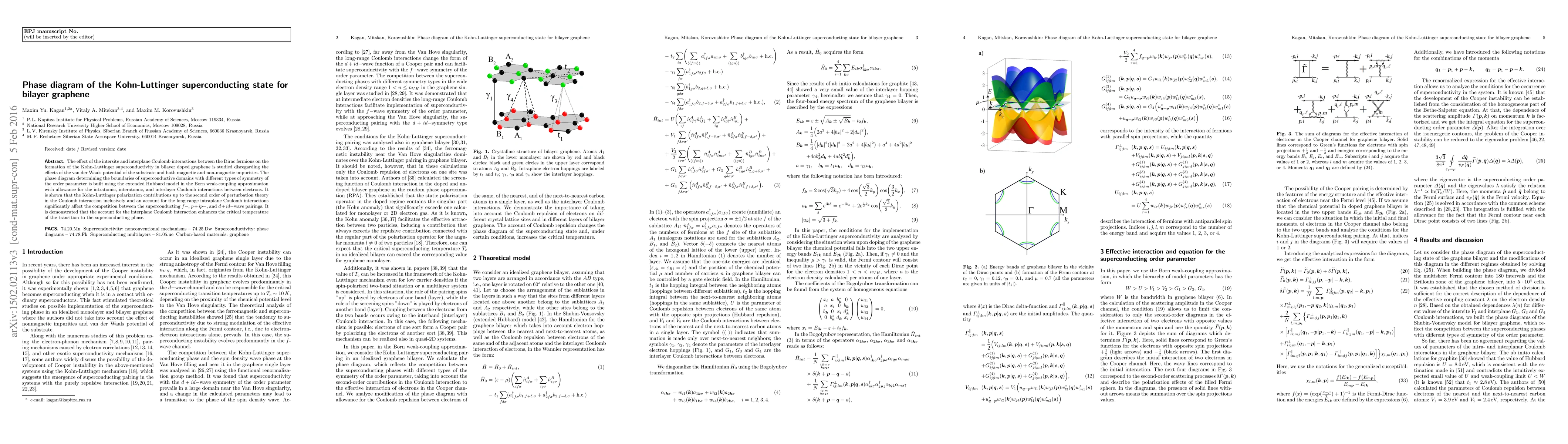 The effect of the intersite and interplane Coulomb interactions between the Dirac fermions on the formation of the Kohn-Luttinger superconductivity in bilayer doped graphene is studied disregarding the effects of the van der Waals potential of the substrate and both magnetic and non-magnetic impurities. The phase diagram determining the boundaries of superconductive domains with different types of symmetry of the order parameter is built using the extended Hubbard model in the Born weak-coupling approximation with allowance for the intratomic, interatomic, and interlayer Coulomb interactions between electrons. It is shown that the Kohn-Luttinger polarization contributions up to the second order of perturbation theory in the Coulomb interaction inclusively and an account for the long-range intraplane Coulomb interactions significantly affect the competition between the superconducting $f-$, $p+ip-$, and $d+id-$wave pairings. It is demonstrated that the account for the interplane Coulomb interaction enhances the critical temperature of the transition to the superconducting phase.