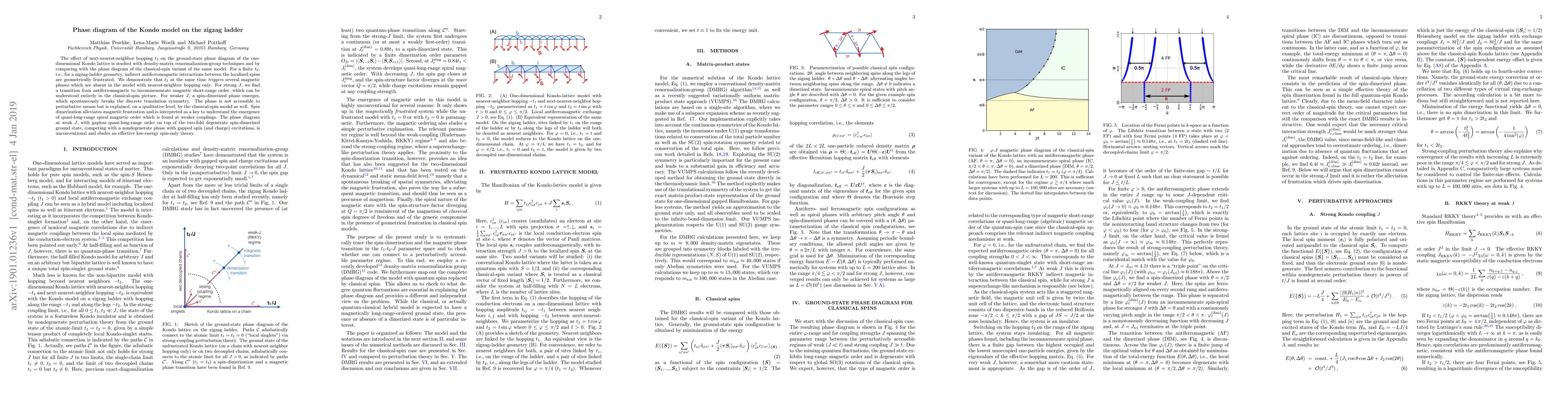 The effect of next-nearest-neighbor hopping $t_{2}$ on the ground-state phase diagram of the one-dimensional Kondo lattice is studied with density-matrix renormalization-group techniques and by comparing with the phase diagram of the classical-spin variant of the same model. For a finite $t_{2}$, i.e., for a zigzag-ladder geometry, indirect antiferromagnetic interactions between the localized spins are geometrically frustrated. We demonstrate that $t_{2}$ at the same time triggers several magnetic phases which are absent in the model with nearest-neighbor hopping only. For strong $J$, we find a transition from antiferromagnetic to incommensurate magnetic short-range order, which can be understood entirely in the classical-spin picture. For weaker $J$, a spin-dimerized phase emerges, which spontaneously breaks the discrete translation symmetry. The phase is not accessible to perturbative means but is explained, on a qualitative level, by the classical-spin model as well. Spin dimerization alleviates magnetic frustration and is interpreted as a key to understand the emergence of quasi-long-range spiral magnetic order which is found at weaker couplings. The phase diagram at weak $J$, with gapless quasi-long-range order on top of the two-fold degenerate spin-dimerized ground state, competing with a nondegenerate phase with gapped spin (and charge) excitations, is unconventional and eludes an effective low-energy spin-only theory.